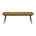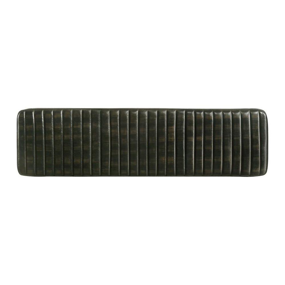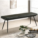 A striking fusion of rustic warmth and industrial edge, this leather-upholstered bench brings comfortable, durable seating and refined style to dining rooms, entryways, or living areas. Hand-dyed goat leather and vertical tufting create a rich, textured surface that wears beautifully with age, while the tapered black metal legs deliver a stable, modern silhouette that complements a wide range of interiors—from farmhouse and industrial to contemporary settings.