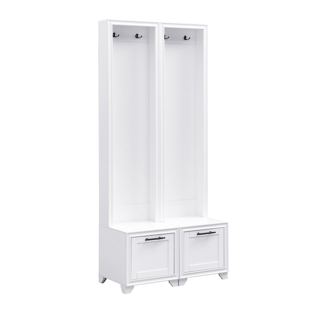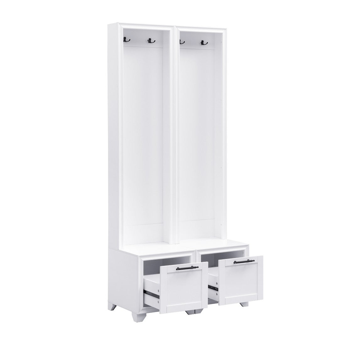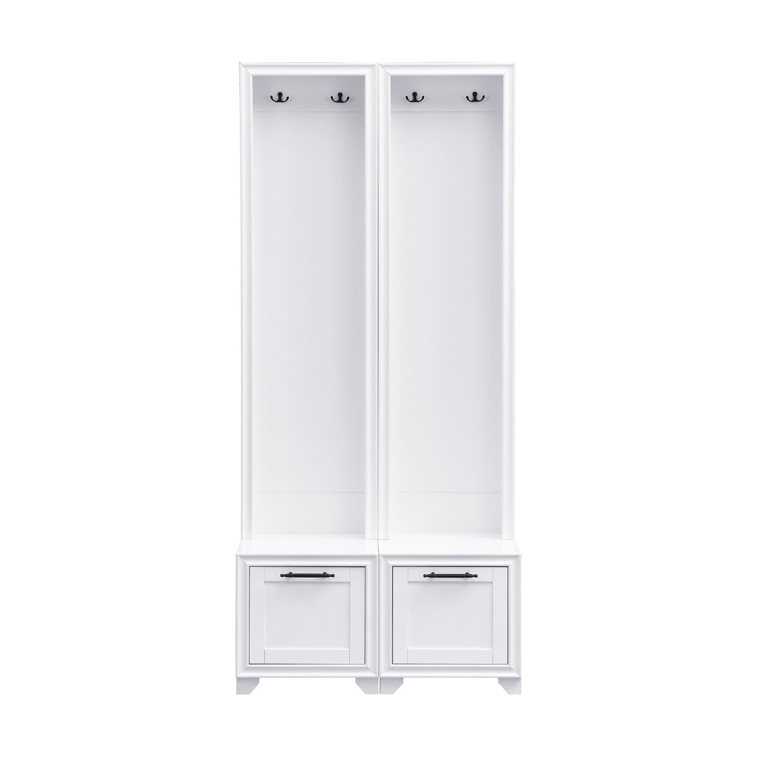 Bring order and vintage charm to your entryway with this elegant set of two freestanding hall trees. Each piece combines a cushioned bench, storage drawers, and sturdy hooks in a compact, vertical design—perfect for narrow spaces, paired placement, or separated use throughout your home. Thoughtful construction and classic detailing, including black retro handles and a painted white finish, make this set both functional and decorative for hallways, mudrooms, or living areas.