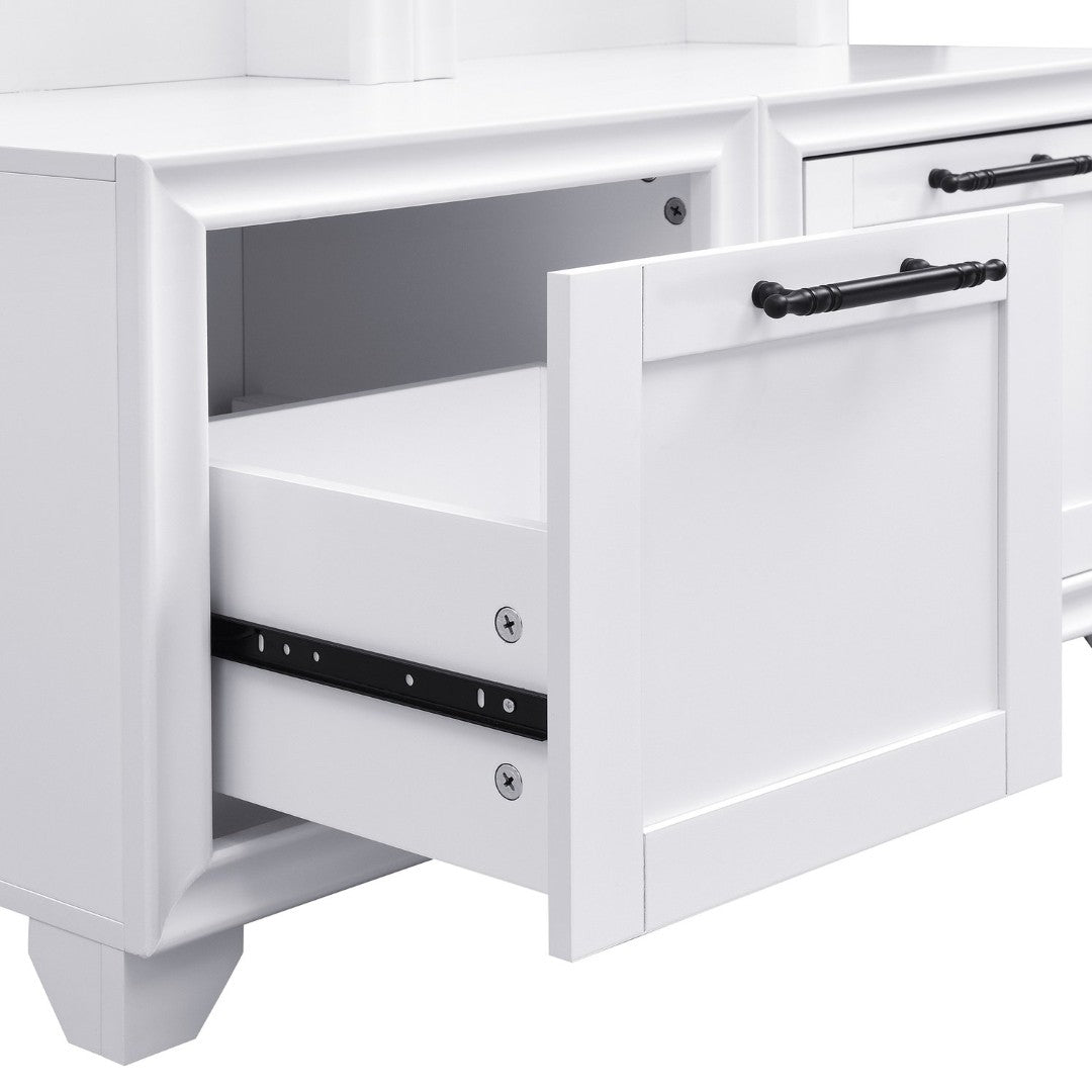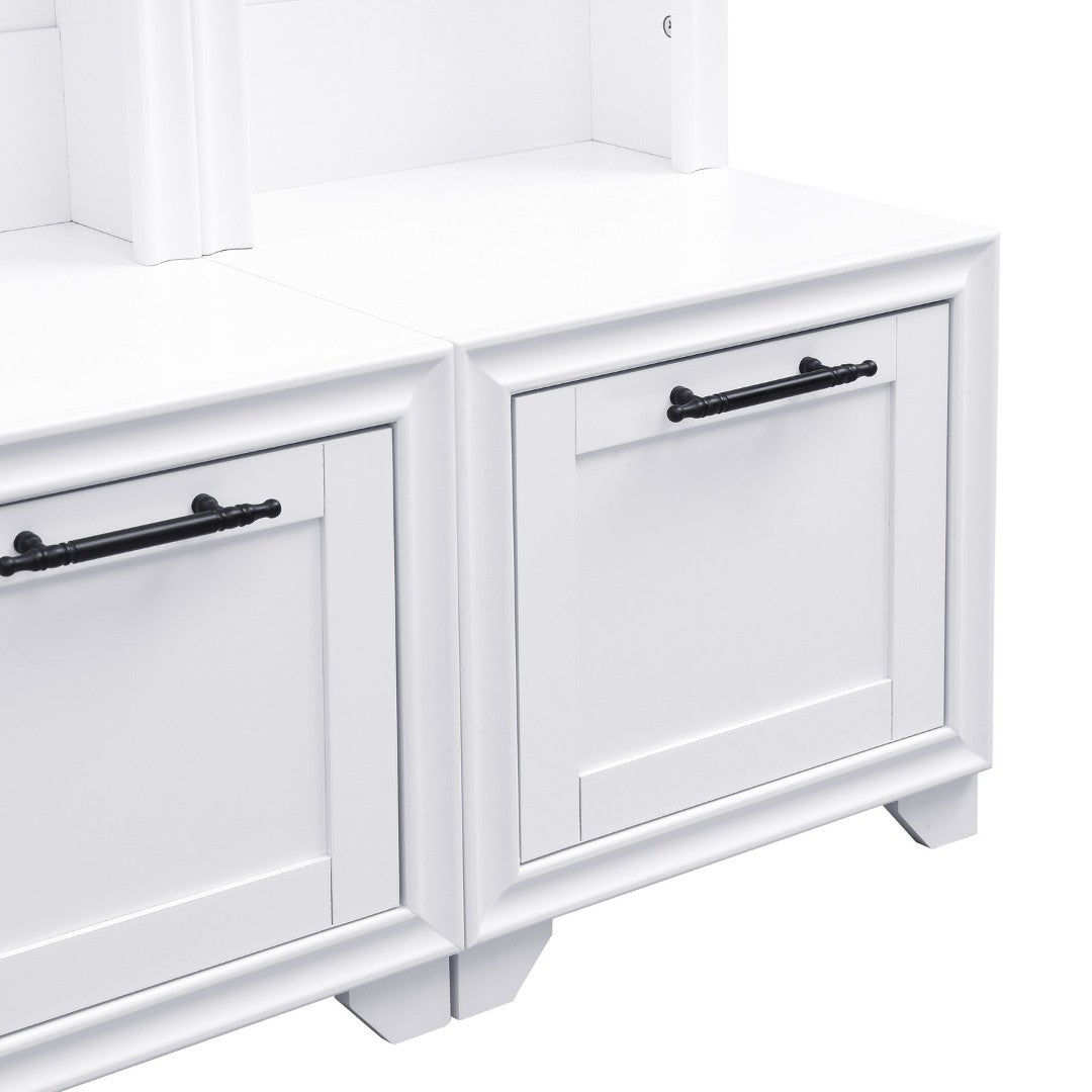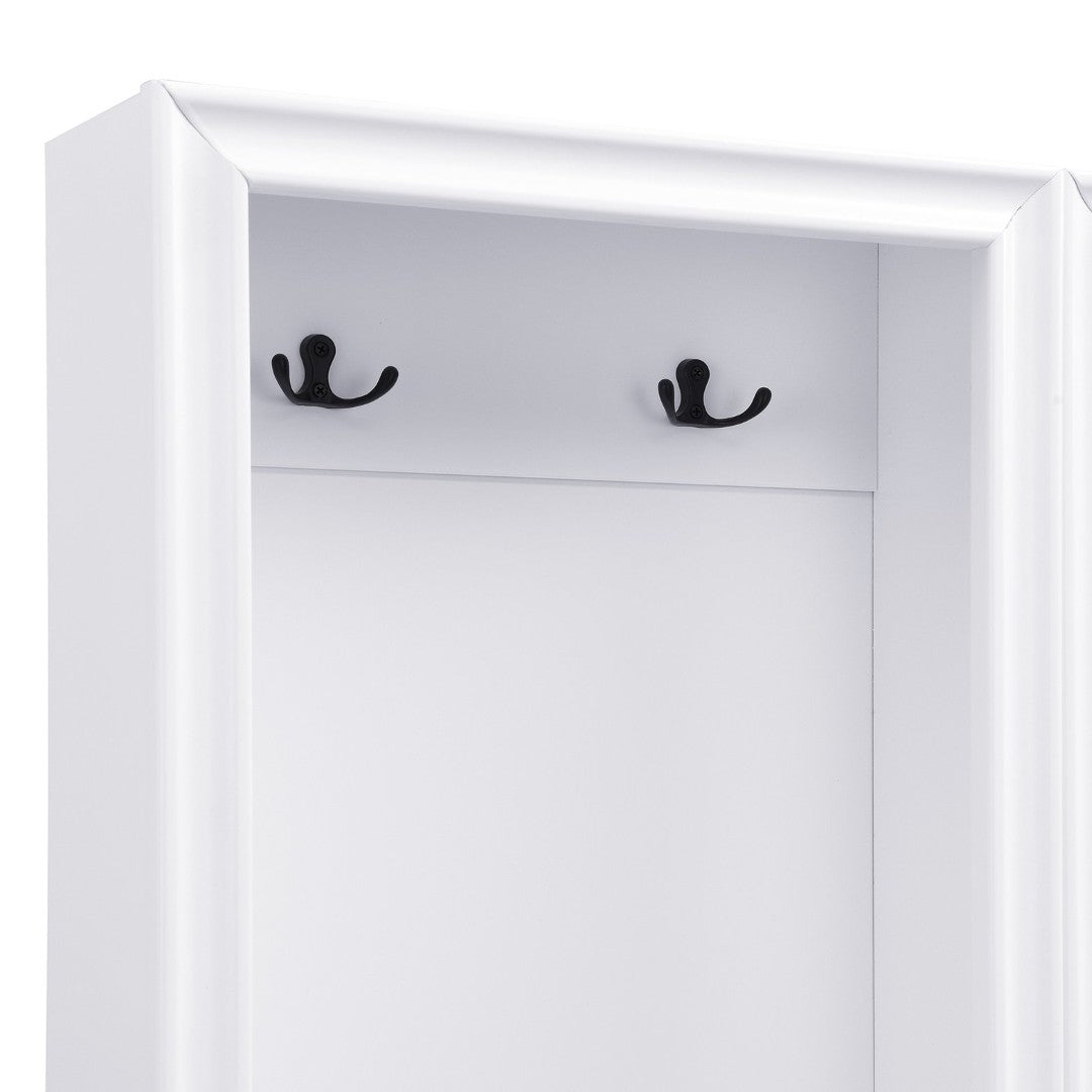 Bring order and vintage charm to your entryway with this elegant set of two freestanding hall trees. Each piece combines a cushioned bench, storage drawers, and sturdy hooks in a compact, vertical design—perfect for narrow spaces, paired placement, or separated use throughout your home. Thoughtful construction and classic detailing, including black retro handles and a painted white finish, make this set both functional and decorative for hallways, mudrooms, or living areas.