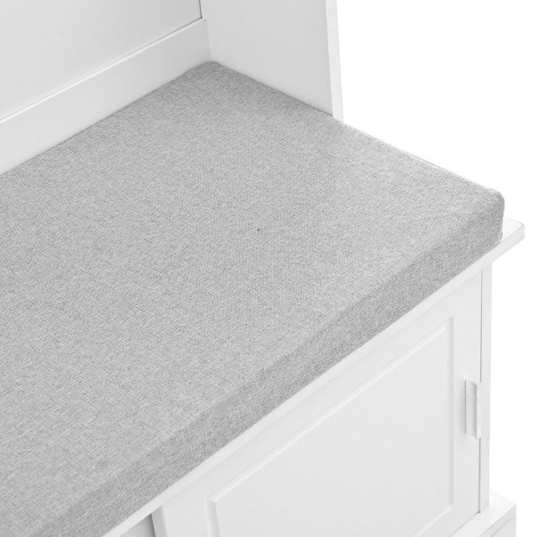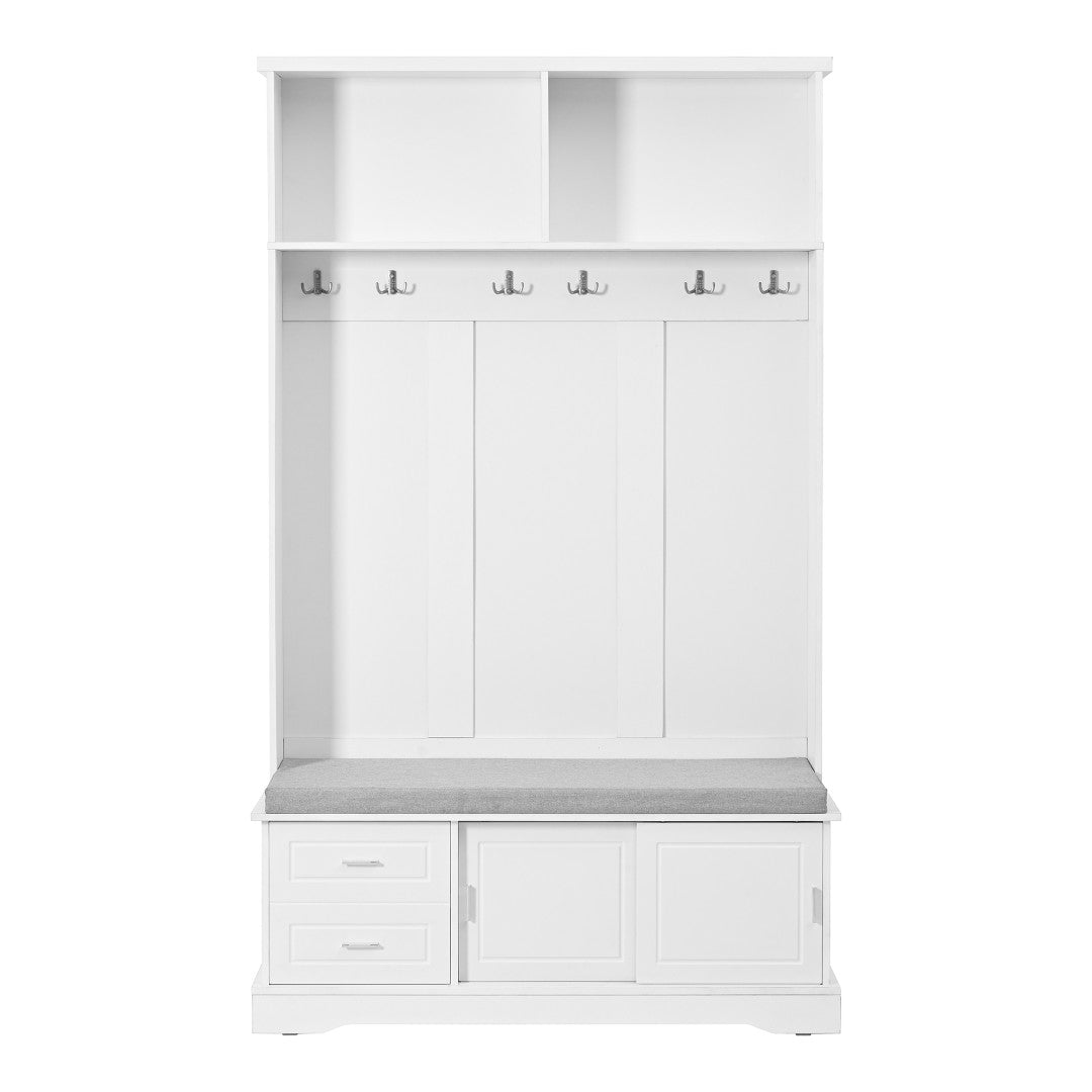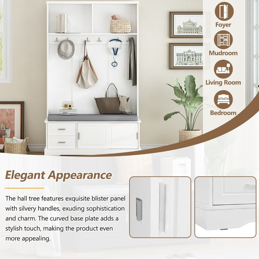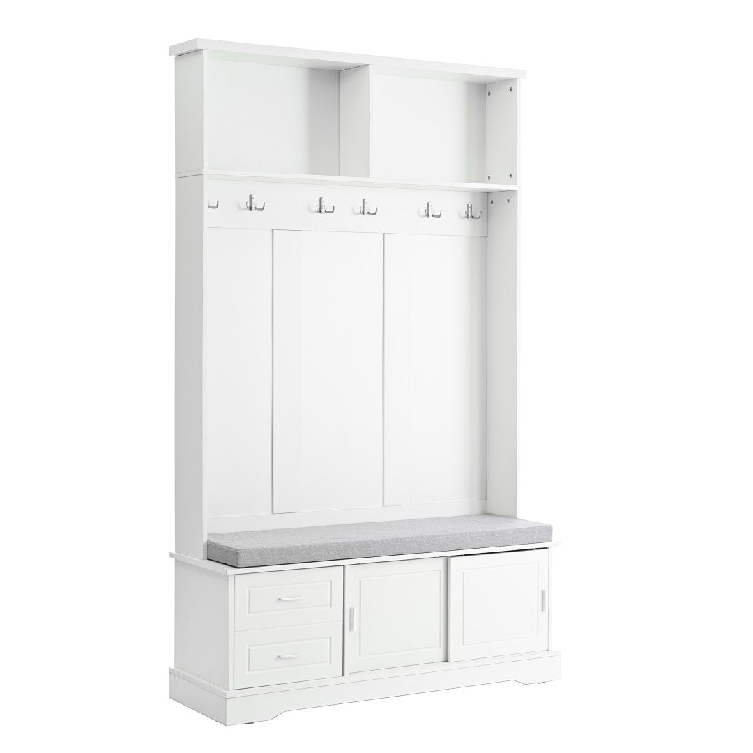 Bring order and style to your entryway with this multifunctional hall tree that combines seating, hanging space, and enclosed storage in a refined white finish. The generously padded, detachable gray cushion provides comfortable seating for putting on shoes and is easy to remove for cleaning. Sleek sliding doors, six silvery metal hooks, and three cabinets keep coats, shoes, and accessories neatly organized while the sturdy construction and anti‑tip hardware ensure long-lasting, safe use.