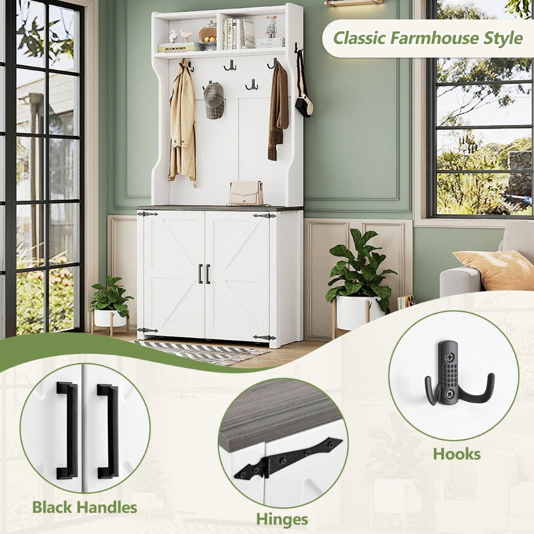 - Adorned with classic retro black handles, hinges and hooks, this hall tree exudes a rustic charm. The gracefully curved boards and two delicate barn doors further elevate the aesthetic of your hall tree, making it suitable to any farmhouse-inspired decor in your home.