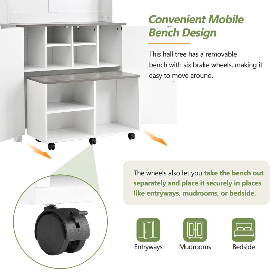 - This hall tree has a removable bench with six brake wheels, making it easy to move around. The wheels also let you take the bench out separately and place it securely in places like entryways, mudrooms, or bedside. Thereby you can get multiple uses from just one product according to your personal need.