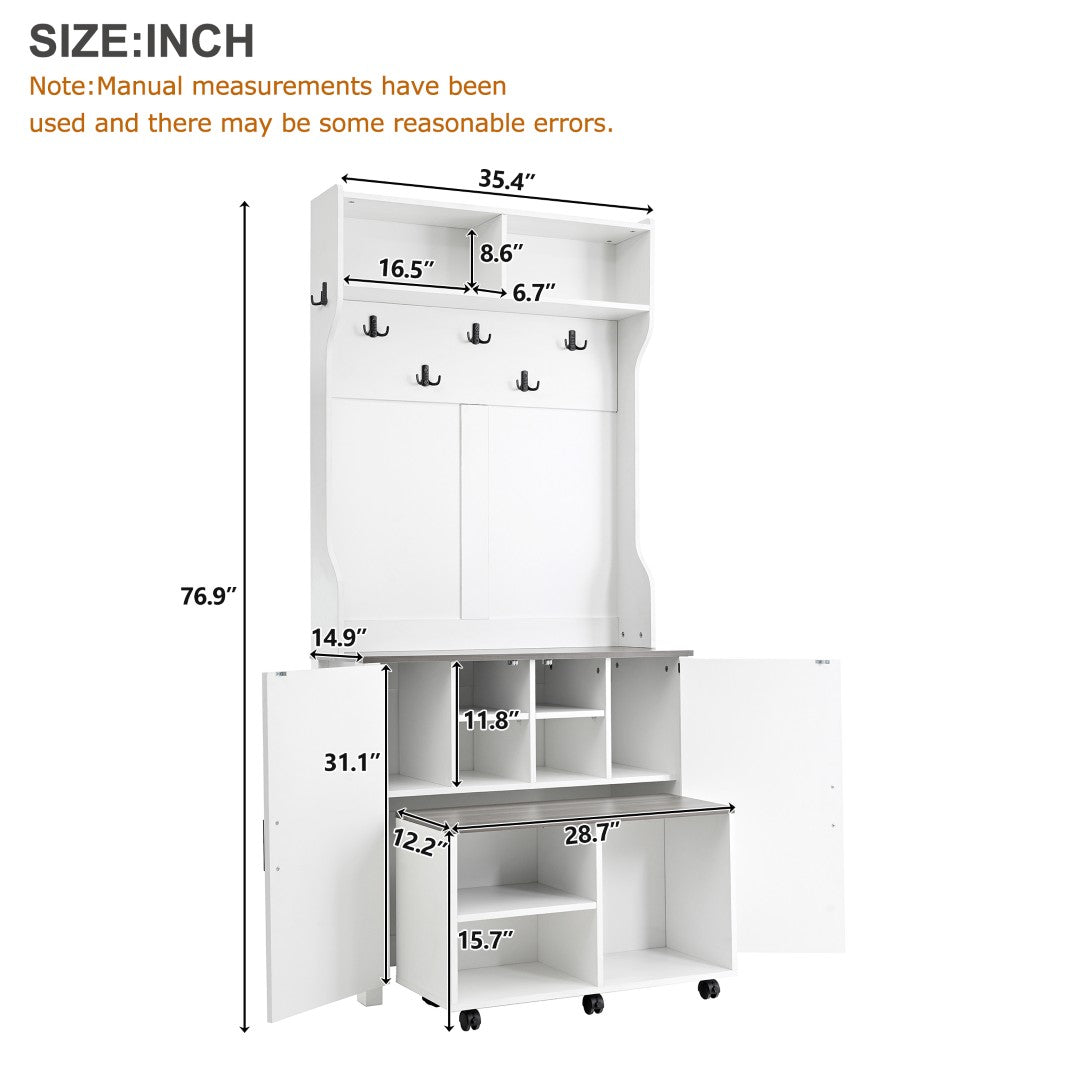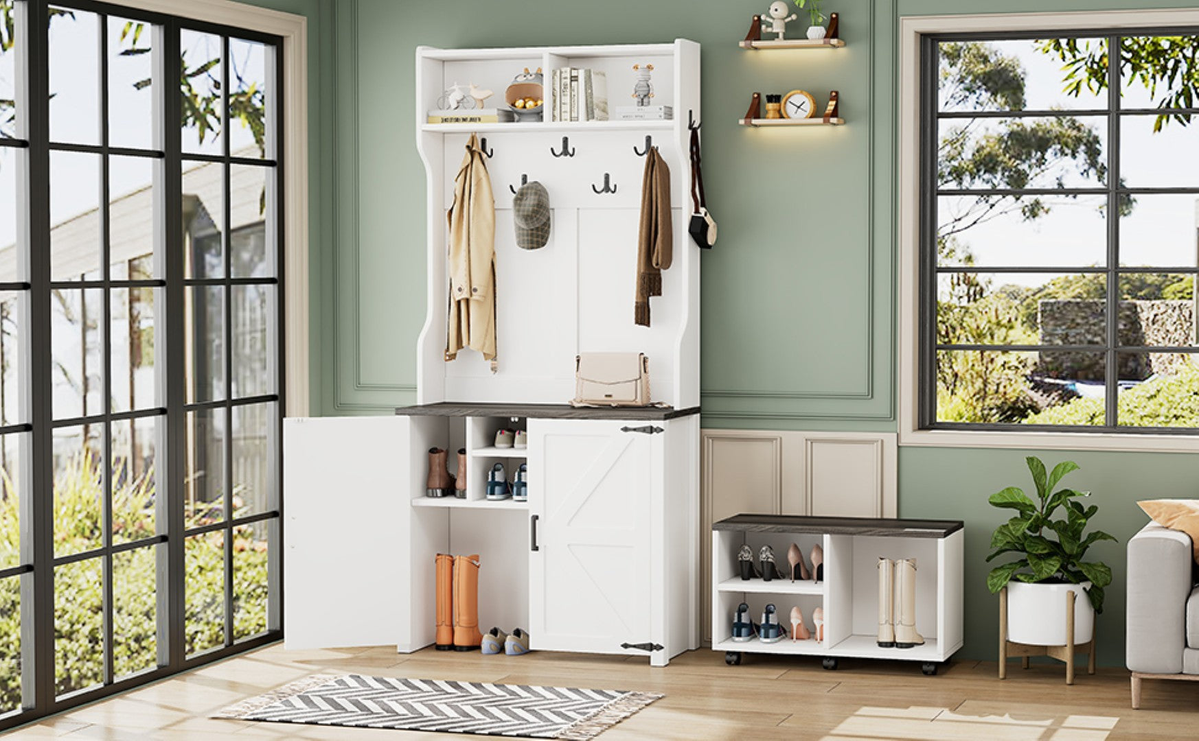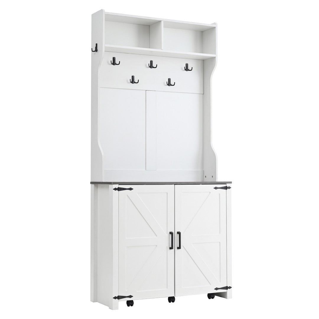 Bring farmhouse charm and smart organization to your entryway with this versatile 4-in-1 hall tree. Thoughtfully designed for everyday use, it combines a coat rack, shoe cabinet, seven hanging hooks, and a movable bench—delivering stylish storage and flexible seating in one compact piece. Durable construction, classic barn-door accents, and smooth-rolling casters make it ideal for busy mudrooms, hallways, or living spaces where function and form matter.