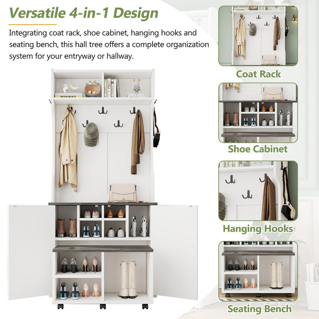- Integrating coat rack, shoe cabinet, hanging hooks and seating bench, this hall tree offers a complete organization system for your entryway or hallway. No matter where it is placed, with this all-in-one furniture piece, you can meet a variety of storage needs in one compact design.