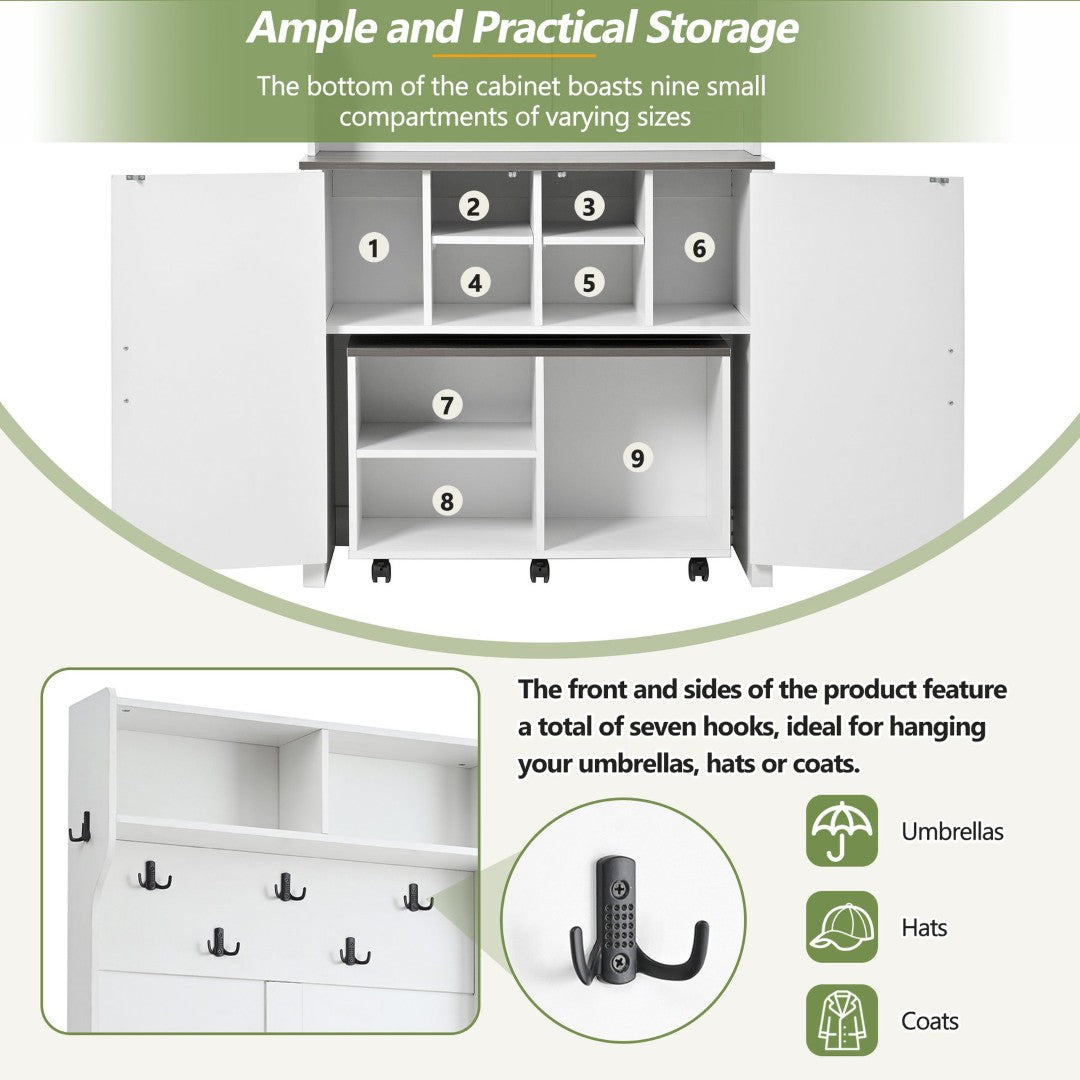 - The bottom of the cabinet boasts nine small compartments of varying sizes, effortlessly accommodating shoes or clutters of different dimensions. The front and sides of the product feature a total of seven hooks, ideal for hanging your umbrellas, hats or coats. It offers versatile storage options for your belongings, presenting you with a tidy entryway.