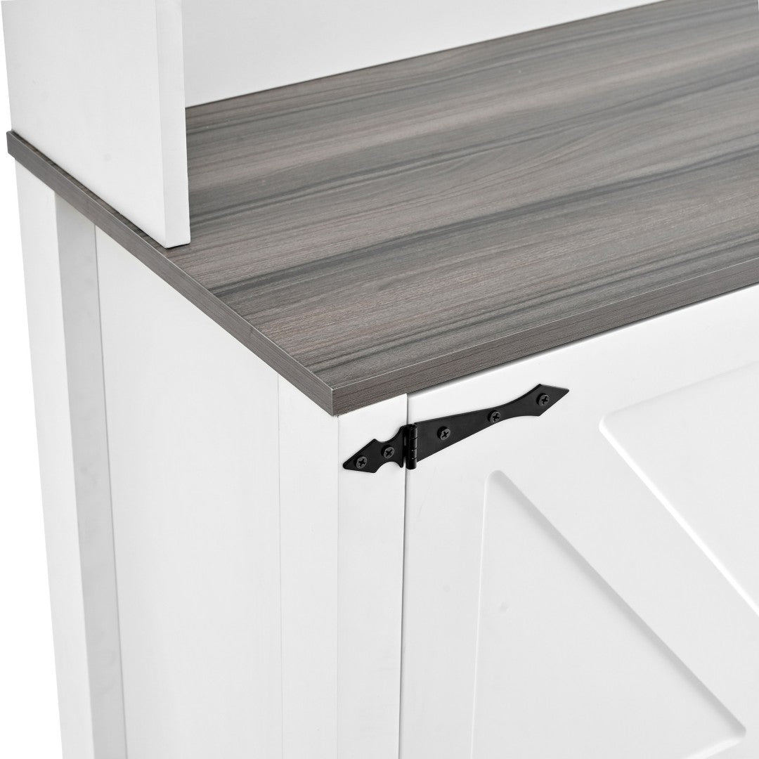 - Classic farmhouse styling: White finish with wood-tone bench, black retro handles, hinges, and barn-door detailing for a rustic, timeless look.