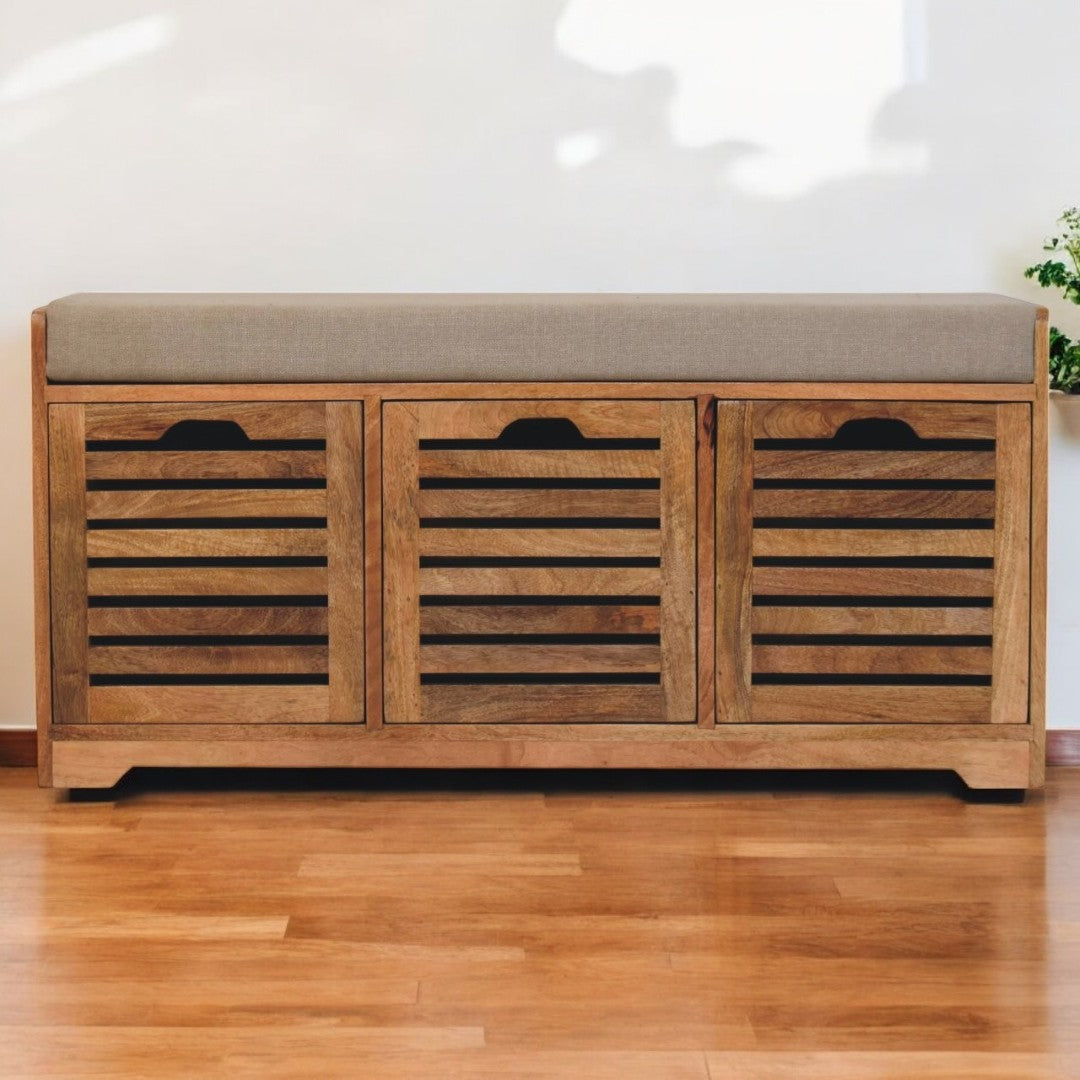 - The Shutter Oak-ish Bench combines form and function effortlessly. Handcrafted from 100% solid mango wood with an elegant oak-ish finish, it features three louvered compartments perfect for organizing your footwear or other essentials. The cream boucle cushioned seat offers a touch of softness and comfort, making it an ideal piece for your entryway, hallway, or bedroom.