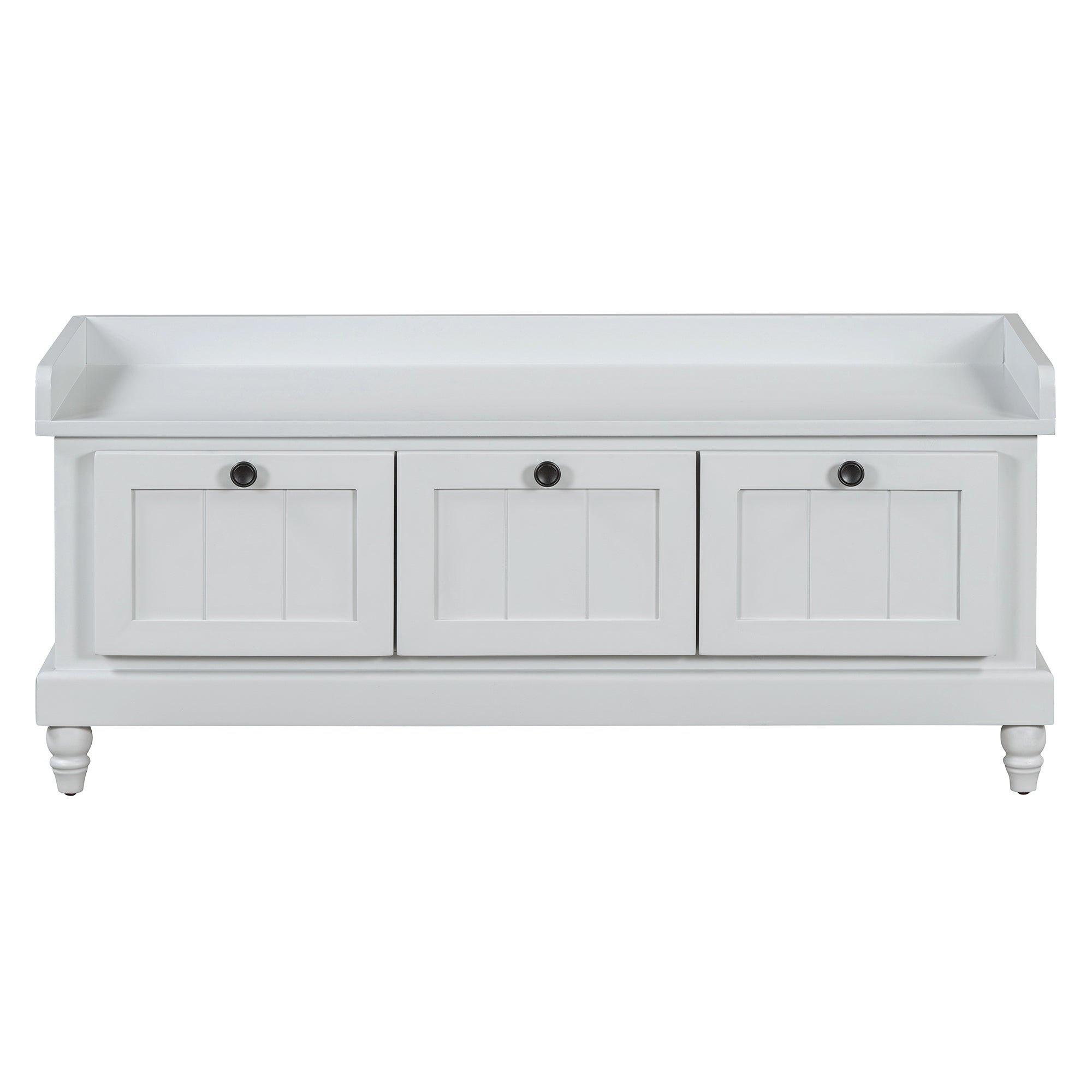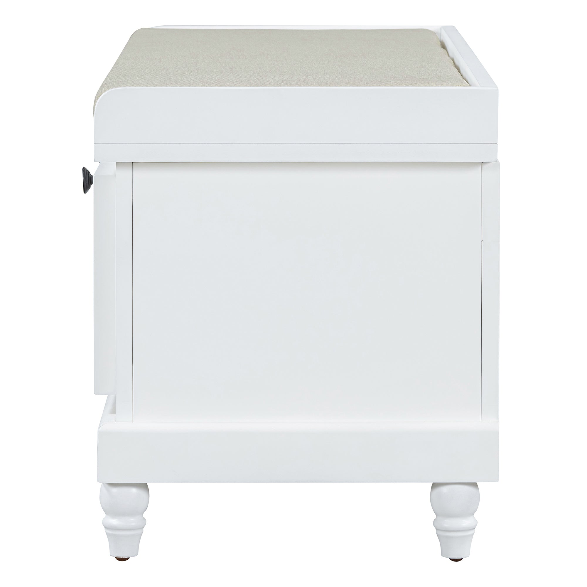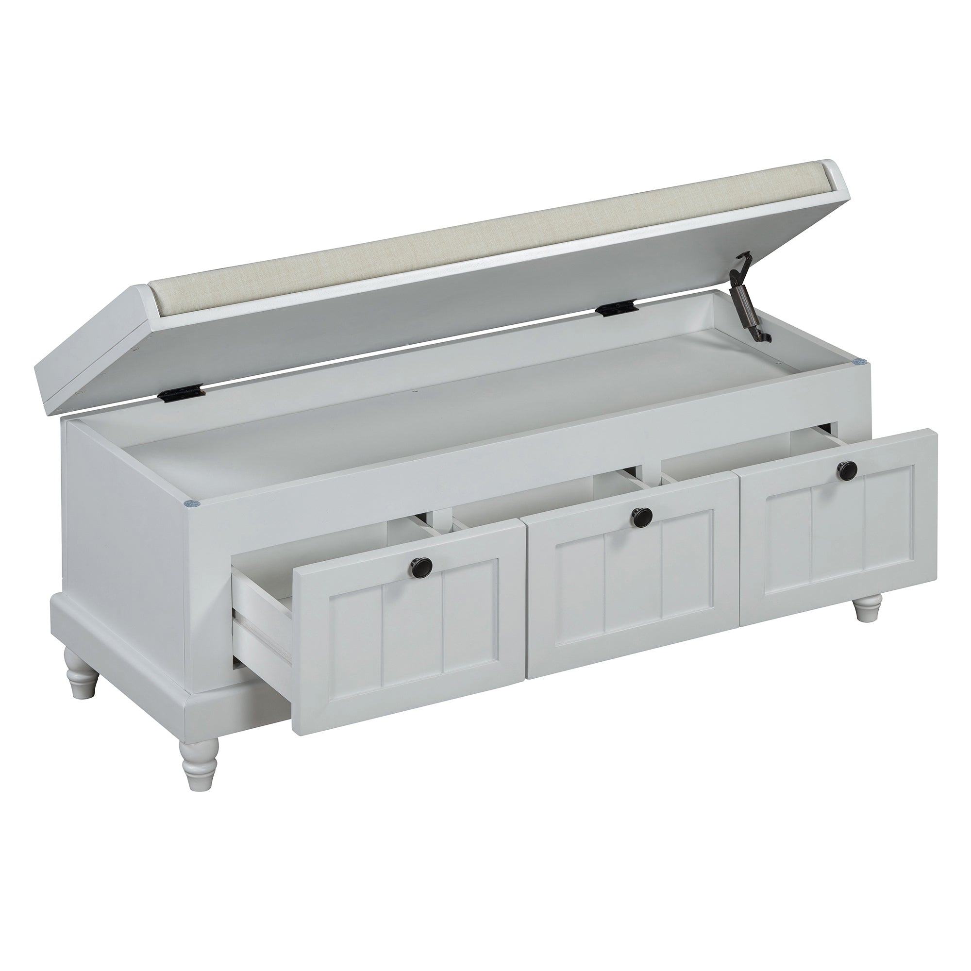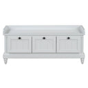 Bring order and comfort to your entryway, hallway, or living room with this classic storage bench. The cushioned top offers comfortable seating for putting on shoes, while three drawers and a hidden compartment keep everyday items neatly organized. Finished in a clean white with fluted detailing and turned legs, the bench blends farmhouse charm with practical functionality for small spaces.