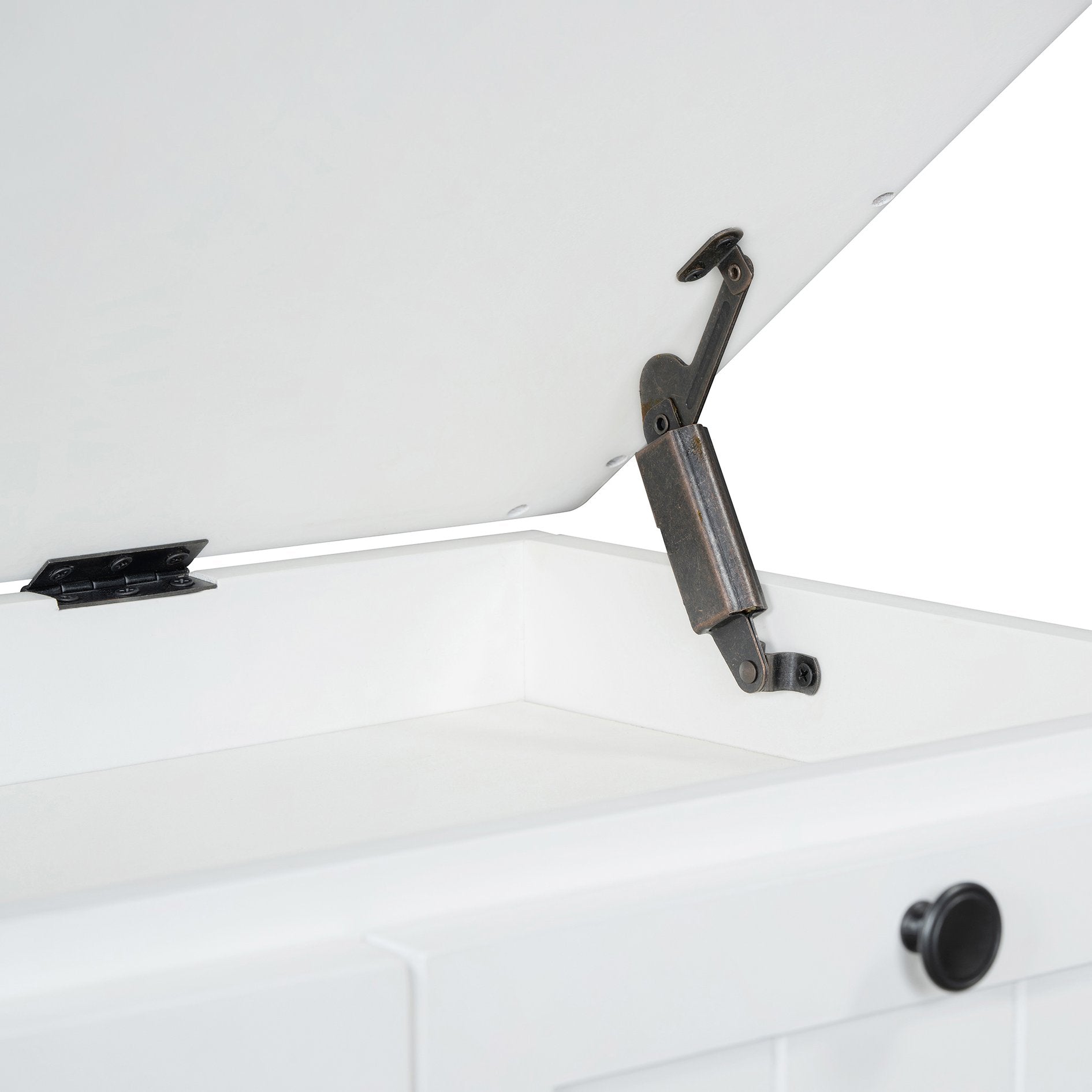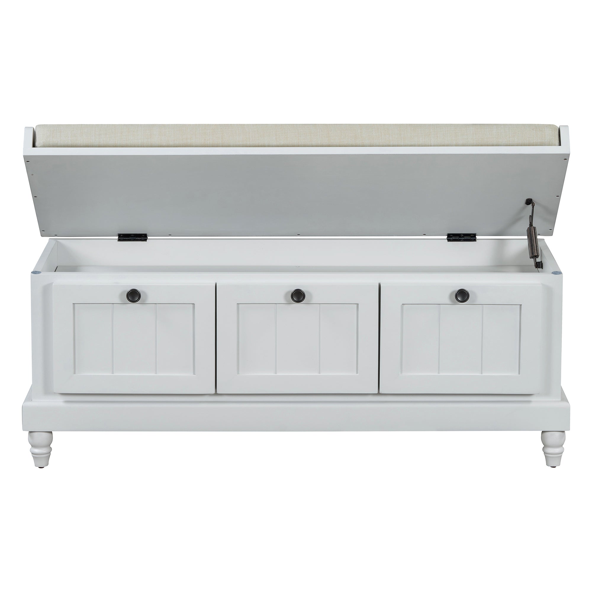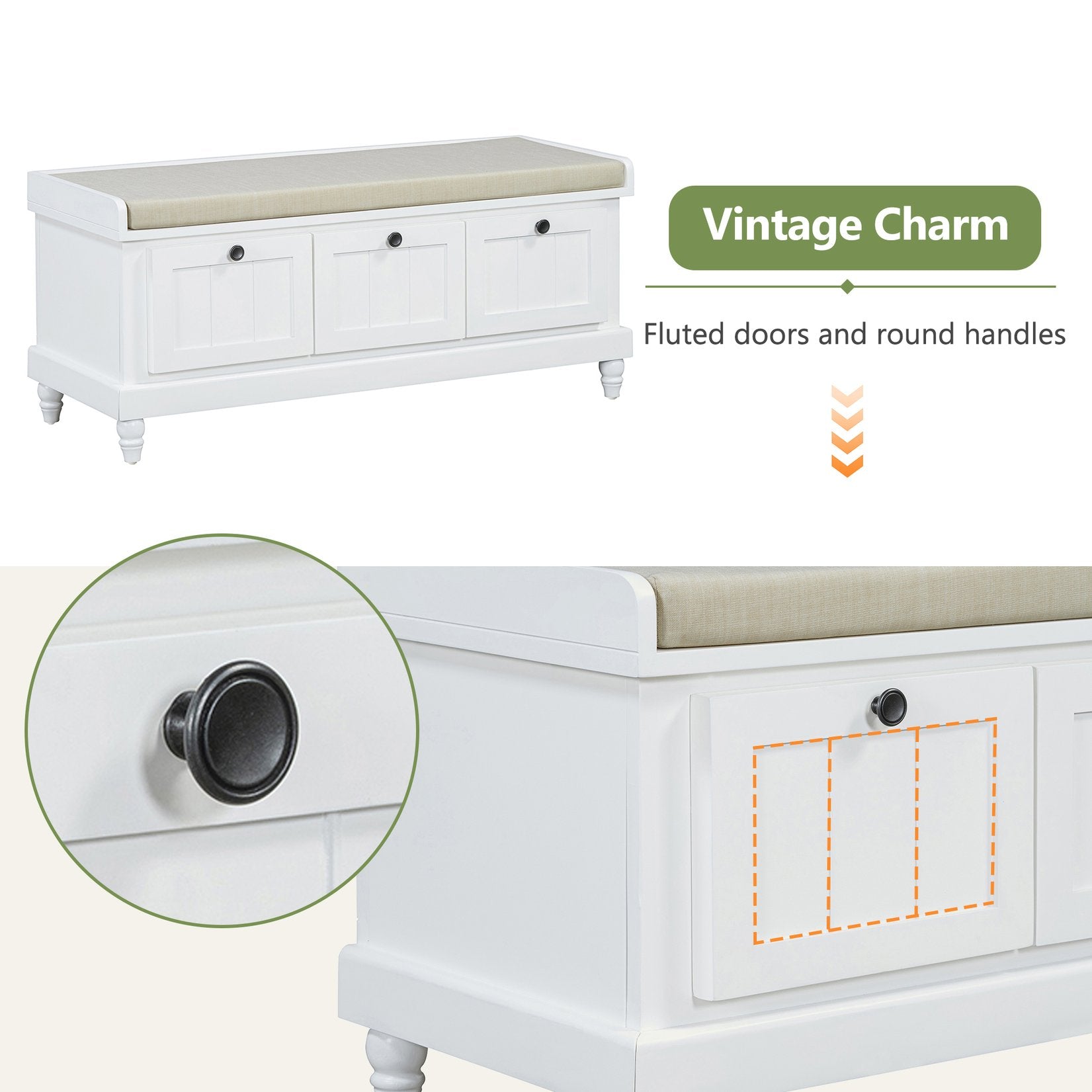 Bring order and comfort to your entryway, hallway, or living room with this classic storage bench. The cushioned top offers comfortable seating for putting on shoes, while three drawers and a hidden compartment keep everyday items neatly organized. Finished in a clean white with fluted detailing and turned legs, the bench blends farmhouse charm with practical functionality for small spaces.