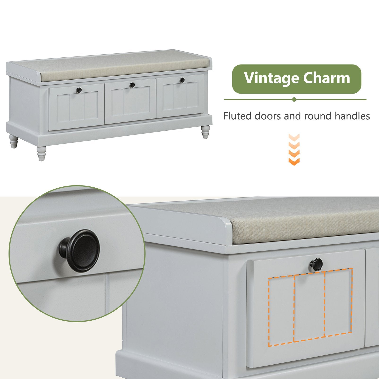 - Classic Design: Featuring grooved doors and round handles, this storage bench combines vintage charm with modern simplicity, making it suitable for various interior styles. Available in four colors—light gray, navy blue, white, and espresso—you can easily find the perfect shade to match your home.