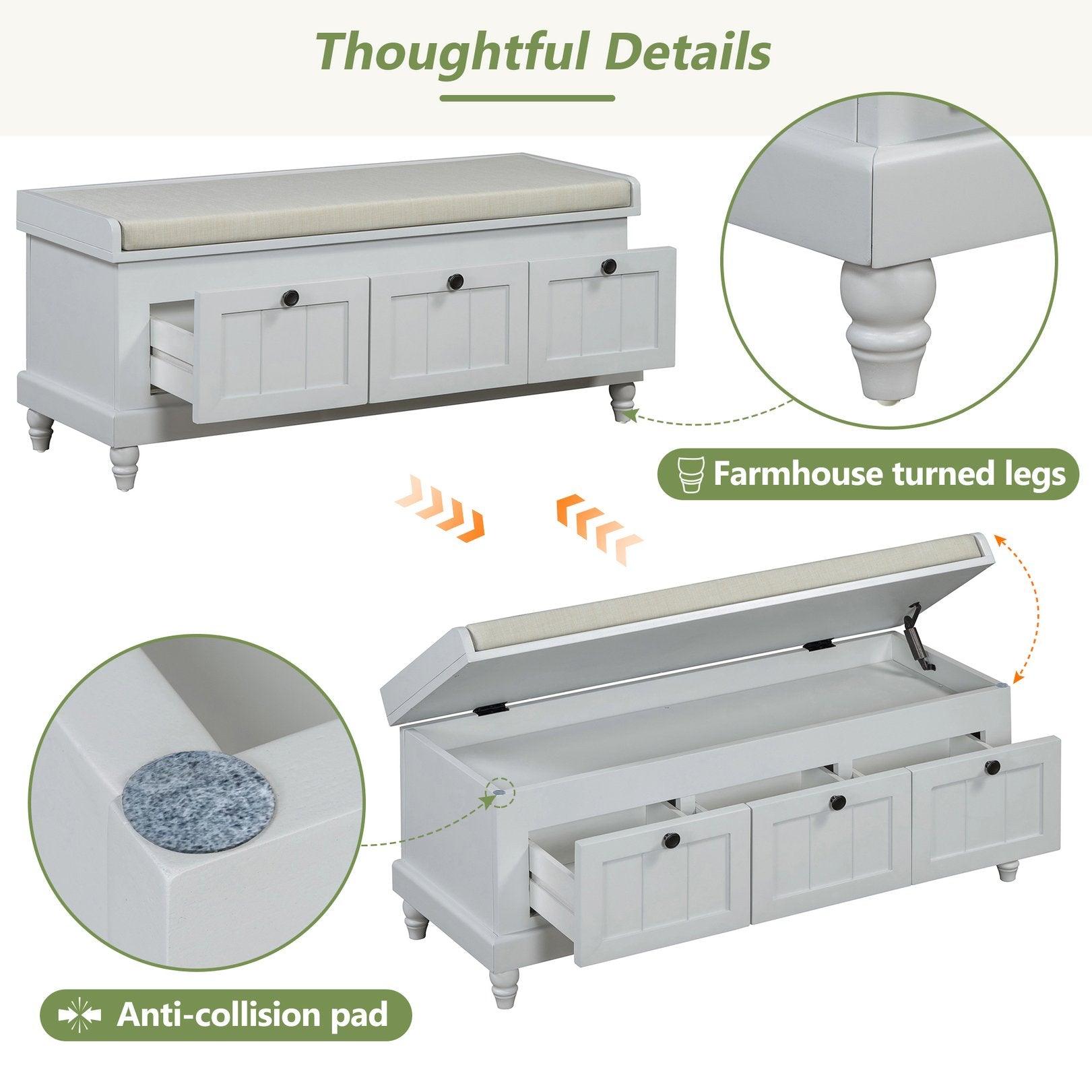 - Thoughtful Details: A soft cushioned seat ensures comfort for use as a shoe bench entryway or extra seating, while the plush pad prevents lid slamming to protect furniture. The farmhouse-turned legs complete the look with rustic charm and timeless elegance.