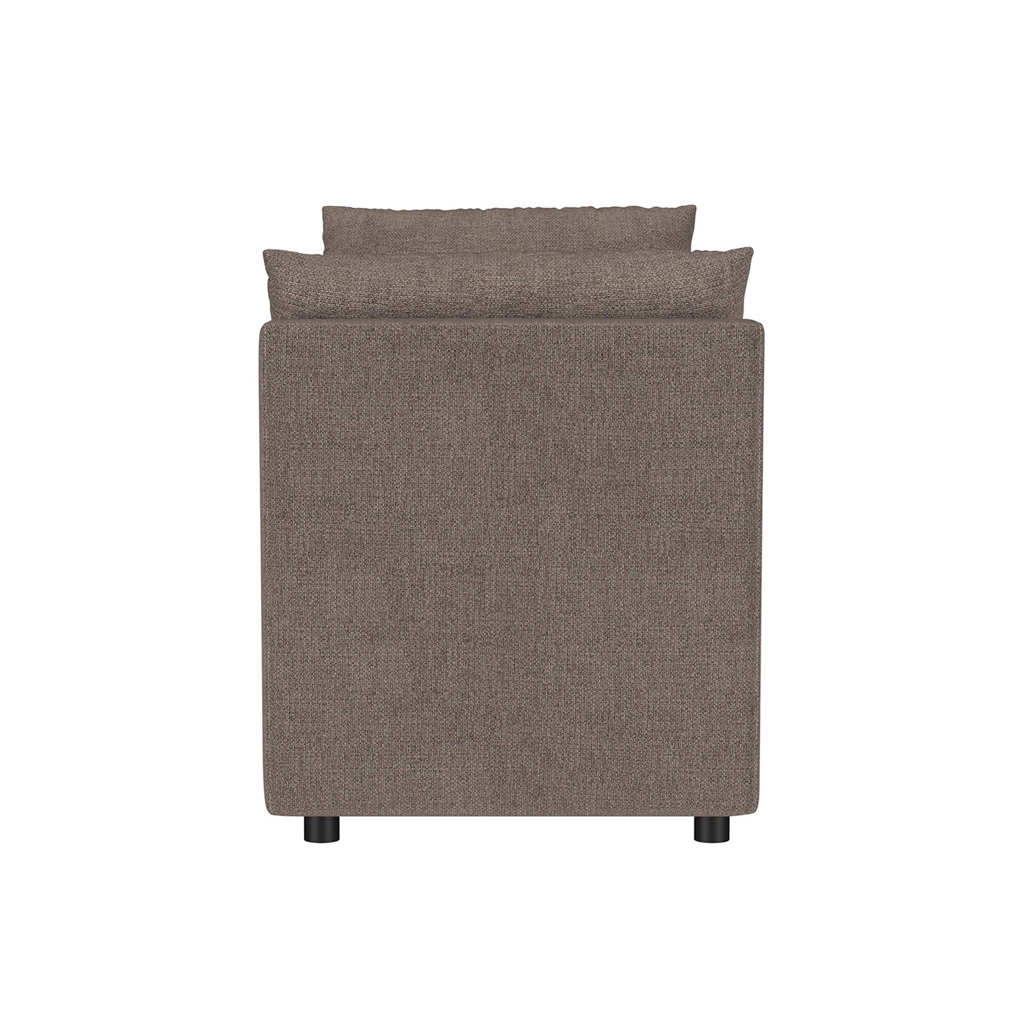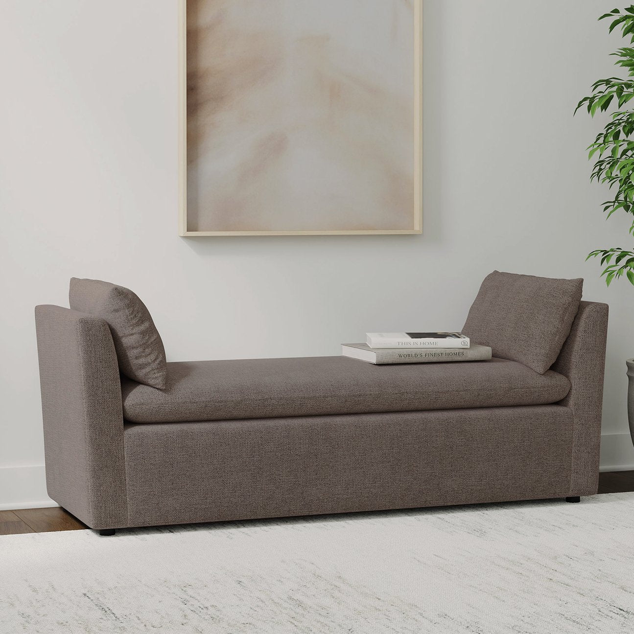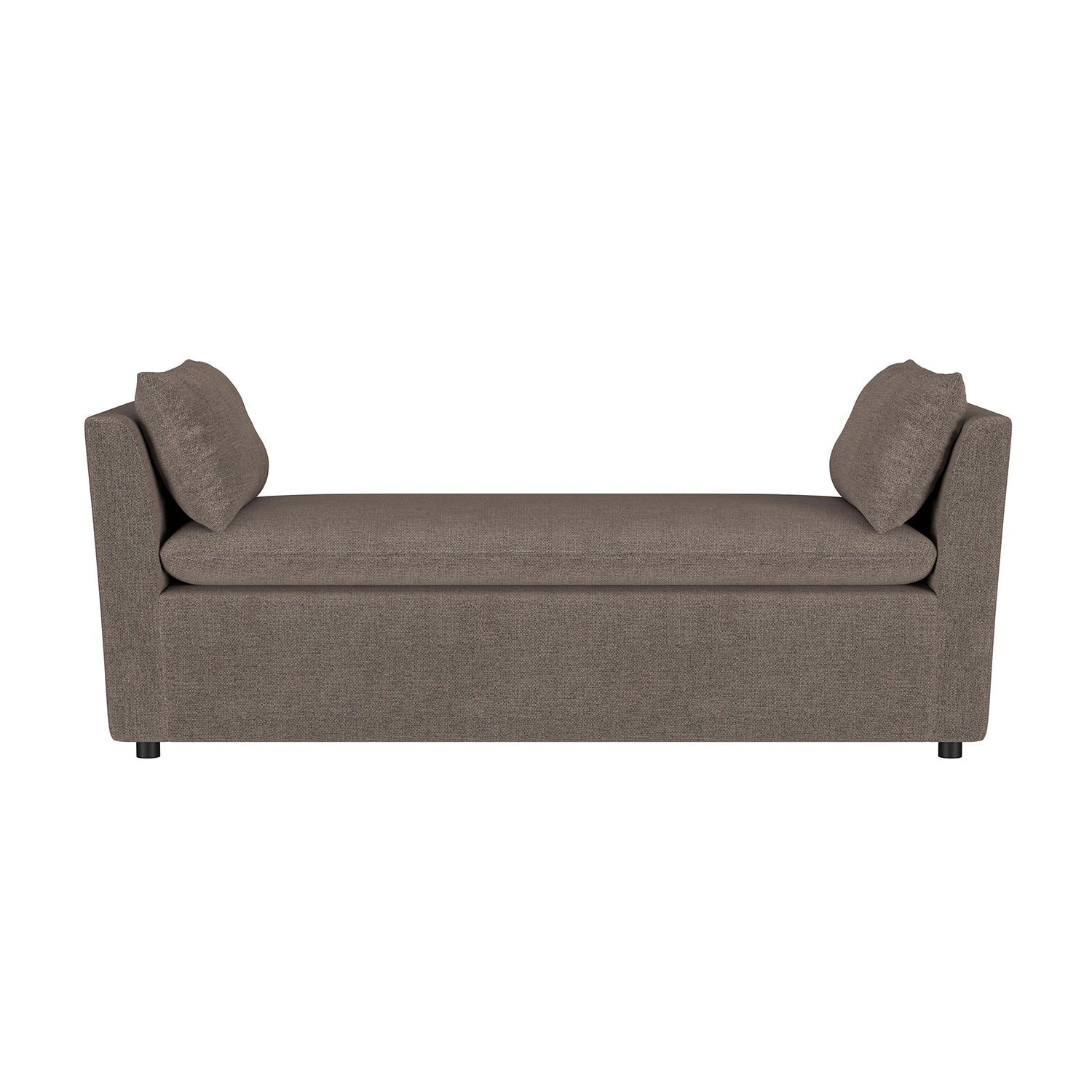 Elevate your living area or master suite with this modern upholstered accent bench — a refined blend of clean lines and comforting details. Its backless silhouette and straight track armrests create a contemporary, streamlined look while the included round bolster pillows add soft, inviting contrast. Built for both style and everyday comfort, this bench makes a tasteful statement in entryways, at the foot of the bed, or as extra seating in a lounge area.