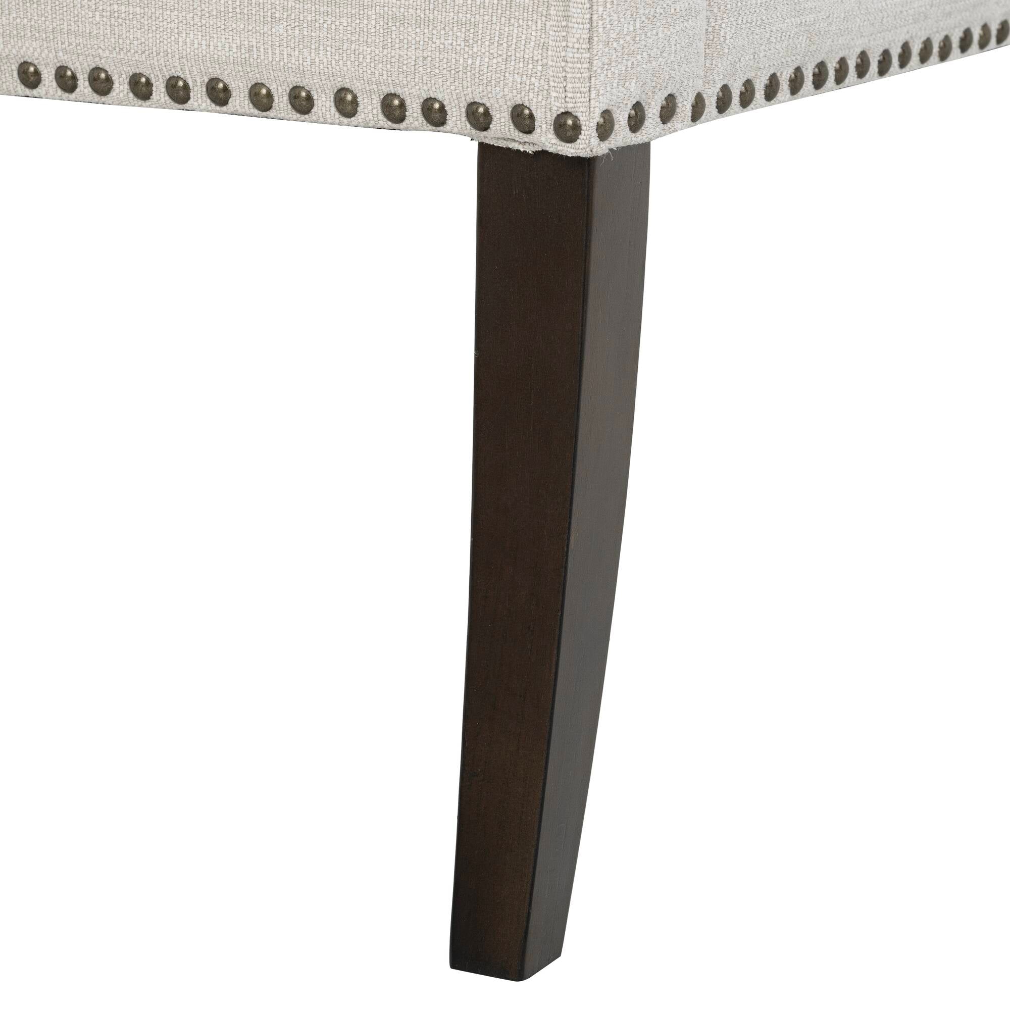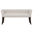 - Compact and elegant accent bench with padded, low-back and flared arms, nail heads and piping details