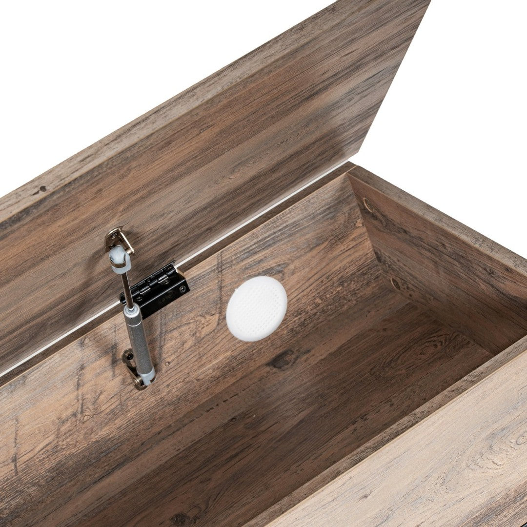 Bring rustic farmhouse warmth and practical storage to your entryway, mudroom, or bedroom with this thoughtfully designed storage bench. The hinged lift-top offers easy access to a generous concealed compartment while the lower shelf provides open storage for shoes, baskets, or décor. Built with durable engineered wood and sturdy metal legs, the bench balances farmhouse character with everyday functionality—ideal for seating, organizing clutter, and creating a tidy, welcoming space.