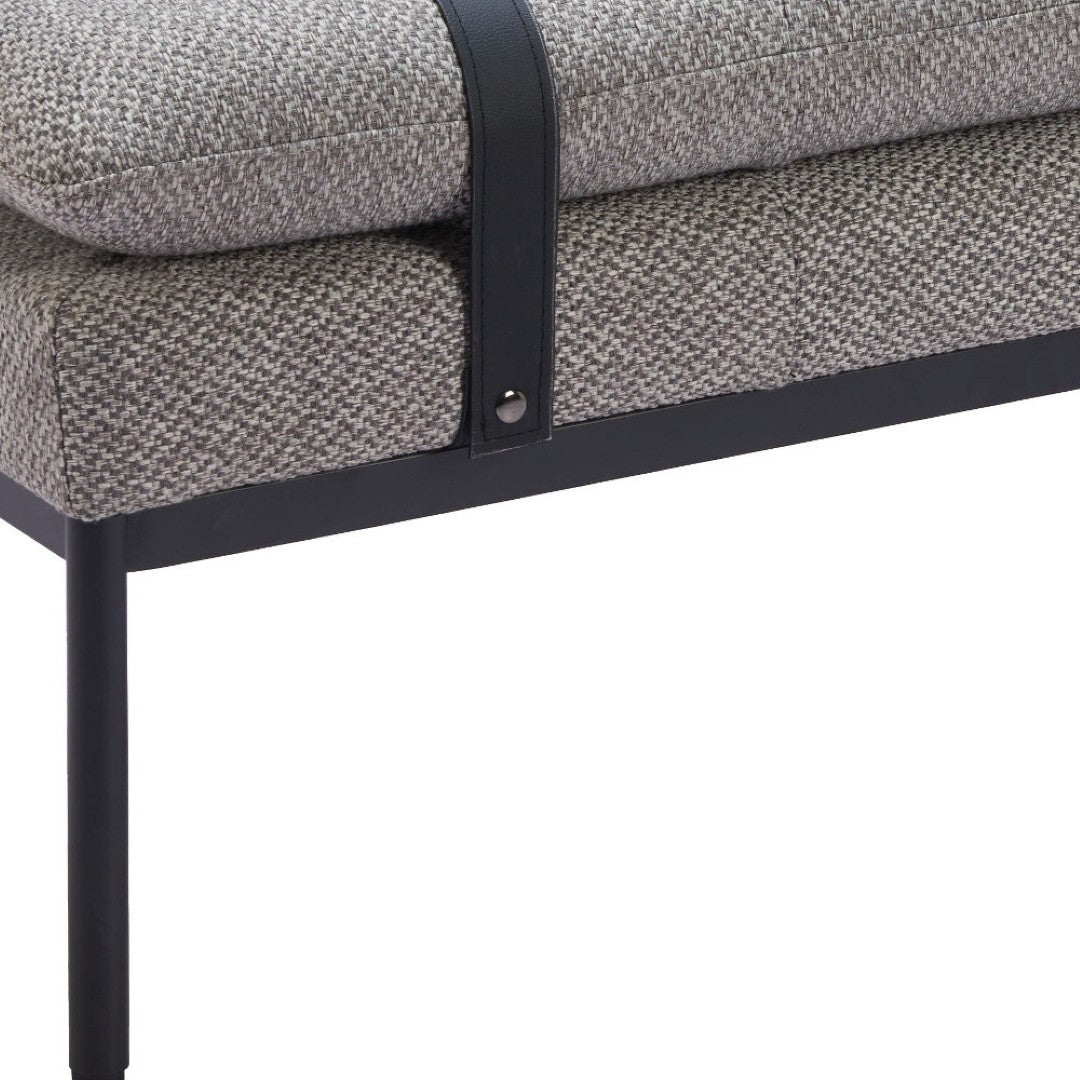 - Modern with a slightly industrial design sense, this double cushion gray bench features faux leather accent straps.