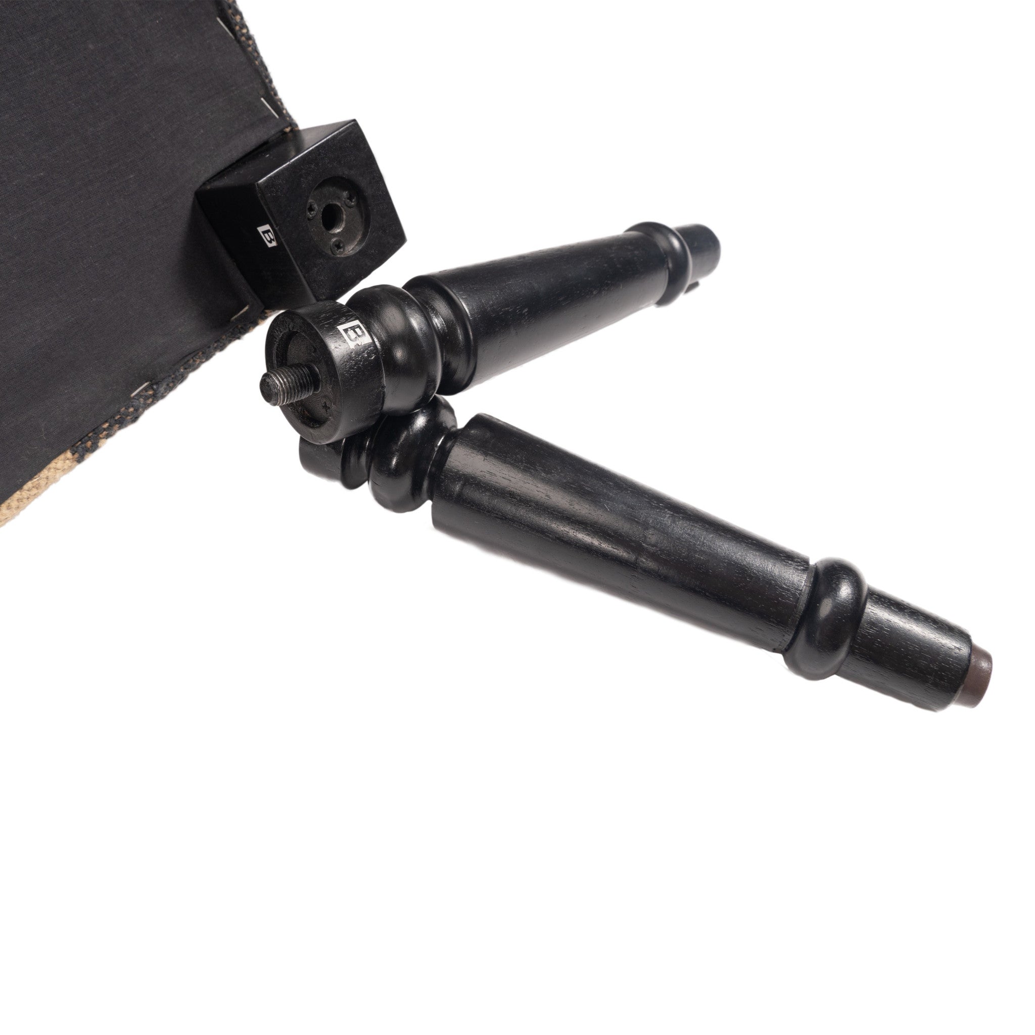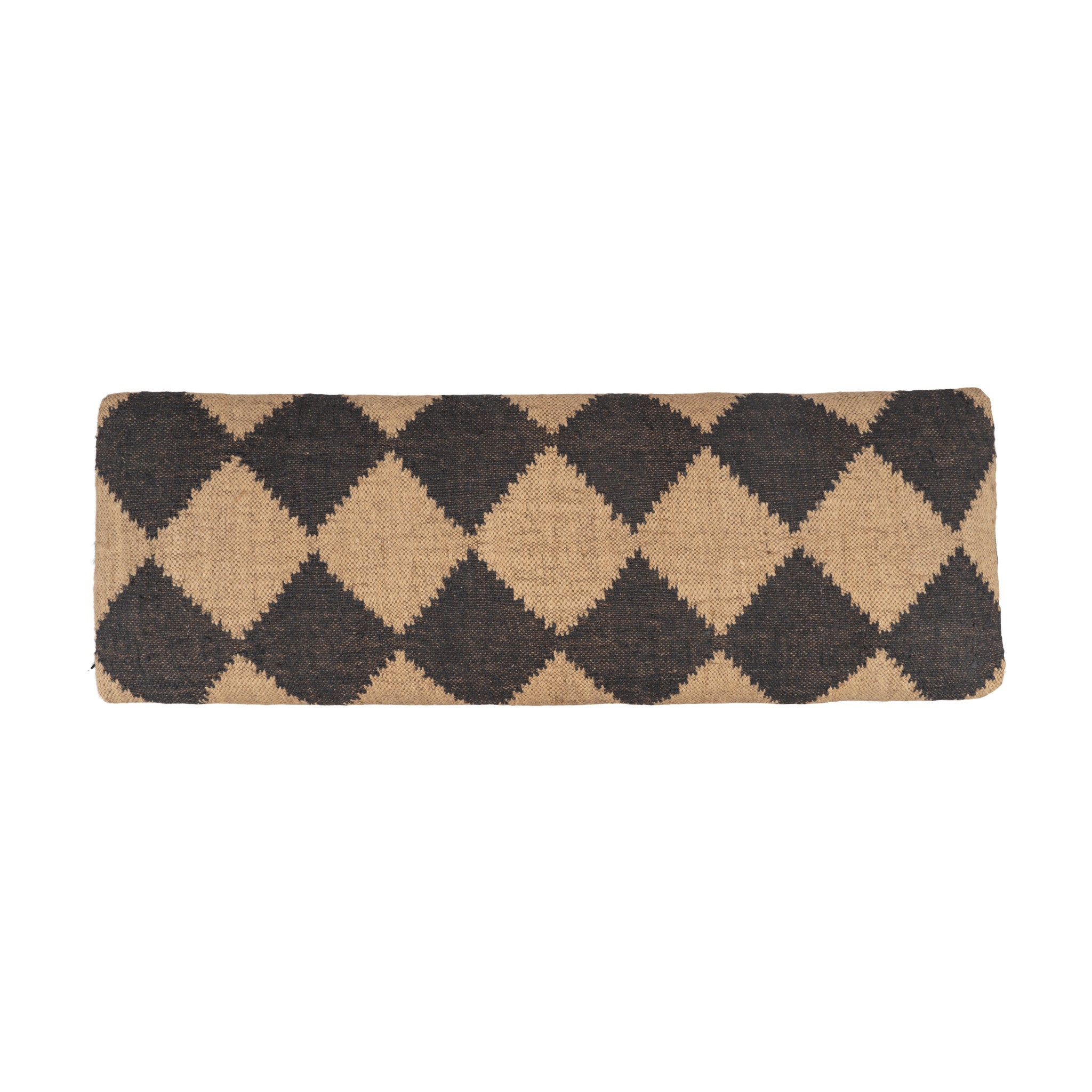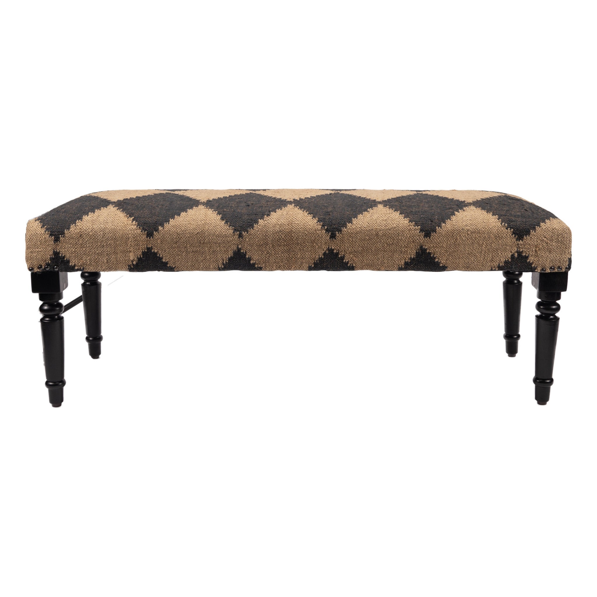 - Textural Brown and Black Southwest Check style upholstered bench with dark wood legs.