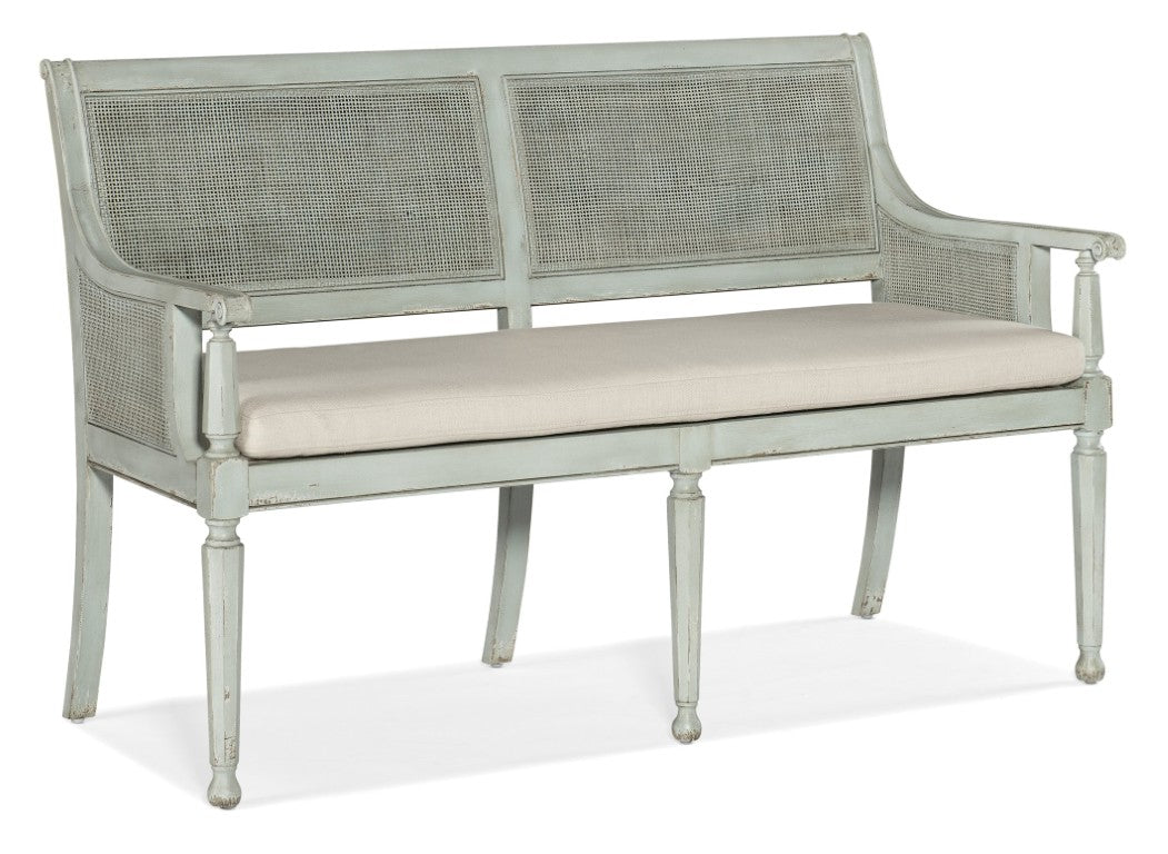 A reimagined classic, the Charleston Bench blends vintage Southern charm with durable, modern detailing. Crafted of solid wood with cane accents across the back and both inside and outside arms, this bench features elegantly shaped legs, a distressed finish for authentic character, and a soft Oyster performance cushion for everyday comfort and easy care. Finished in Haint Blue—a historic hue from Gullah folklore—this piece brings a serene, storied presence to entryways, porches, or living spaces.