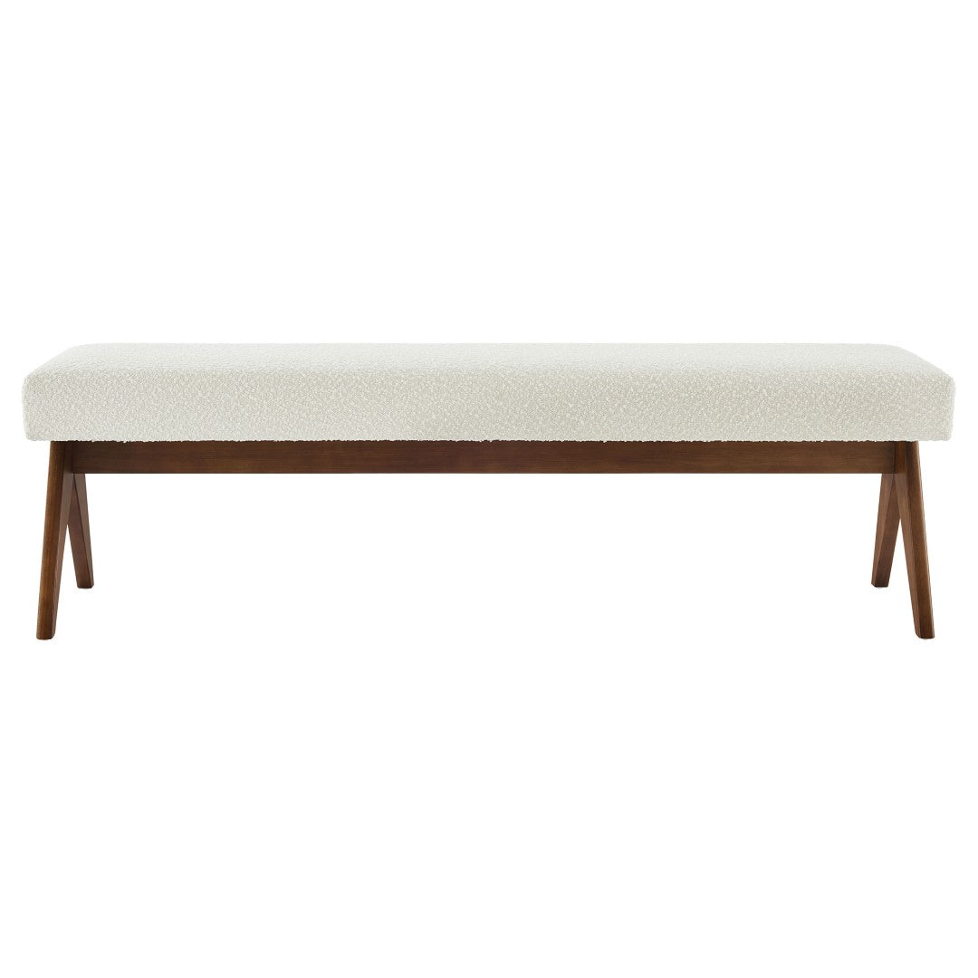 - Boucle Fabric Upholstery 63 Inches Padded Seat Rubberwood Legs Non-Marking Feet Versatile Design Assembly Required