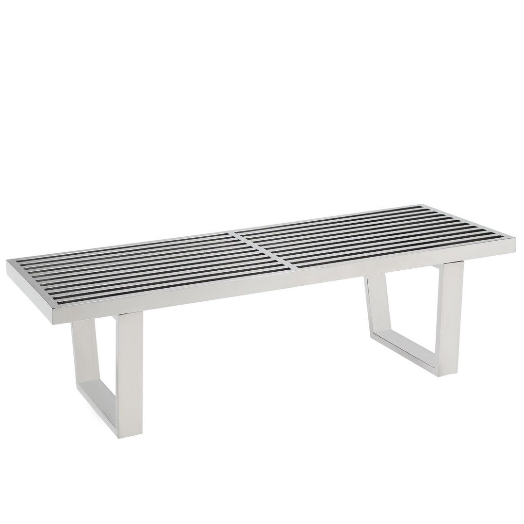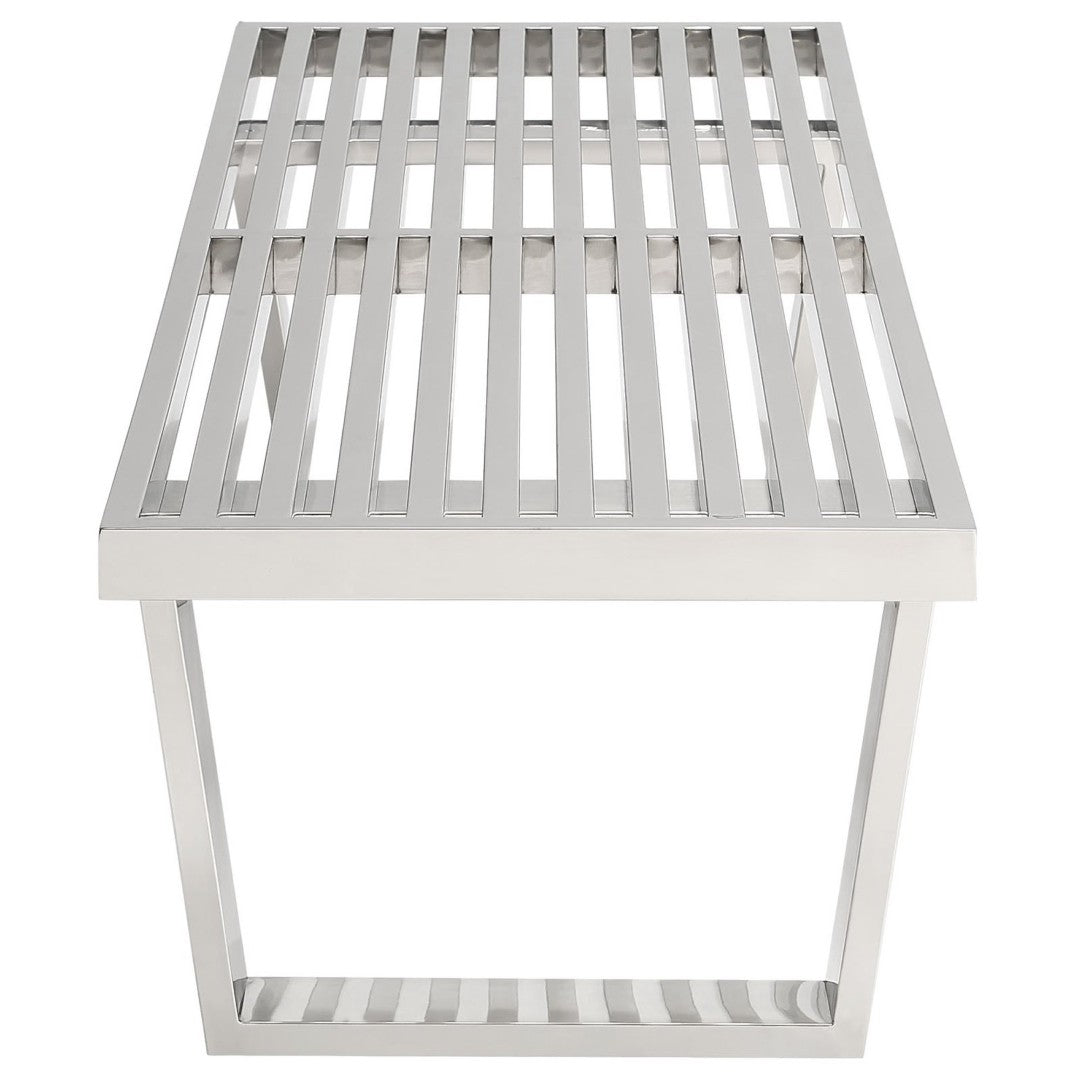 Sleek, sculptural and unmistakably modern, this stainless steel bench blends minimalist form with durable function — ideal as seating, a platform base, or a low table. Its open slotted surface and angled vertical slats create a light, architectural silhouette that reads as mid-century inspired yet forward-looking, making it a versatile focal point for contemporary homes, entryways, patios, or commercial spaces.