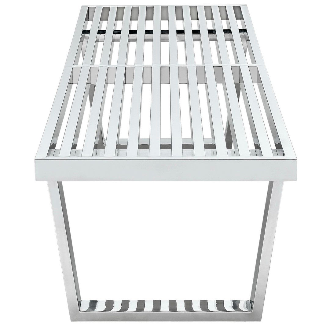 A striking blend of mid-century modern form and everyday function, this stainless steel bench brings sculptural presence and durable performance to entryways, living rooms, patios, or commercial spaces. Its slotted surface and slanted vertical slats create an open, airy profile while the welded metal base provides a stable, legless silhouette that reads both timeless and progressive. Use it as seating, a platform base, or a minimalist table to elevate your space with a piece designed to remain relevant for decades.
