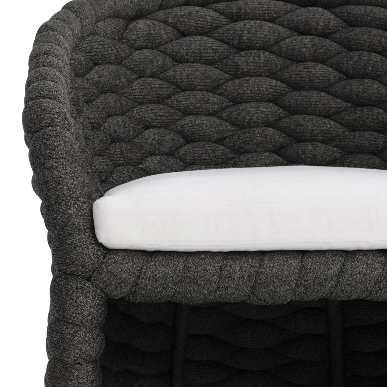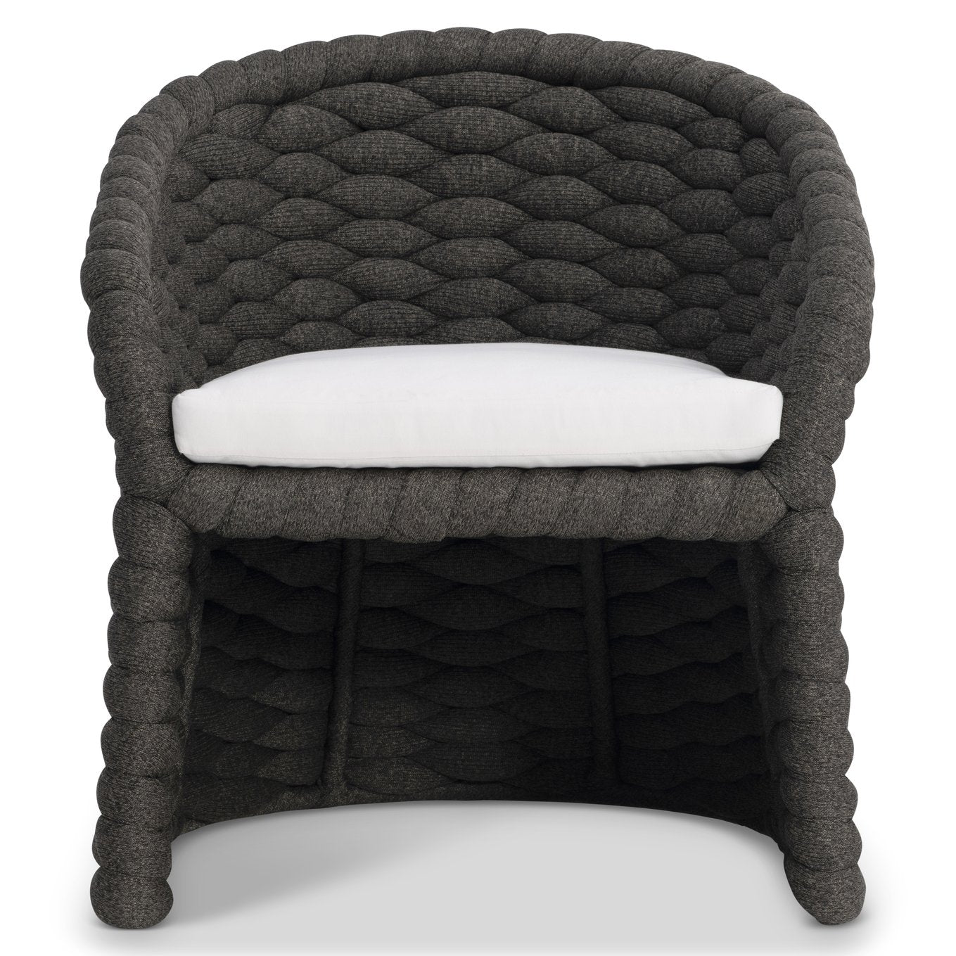 The Salinas arm chair blends modern sculptural design with outdoor durability, offering a comfortable and stylish seating option for patios, decks, and poolside lounges. Its curvaceous aluminum frame wrapped in a soft "sock"-knit weave creates an inviting, tactile silhouette, while the knife-edge back pillow and padded seat ensure comfort without sacrificing contemporary appeal.