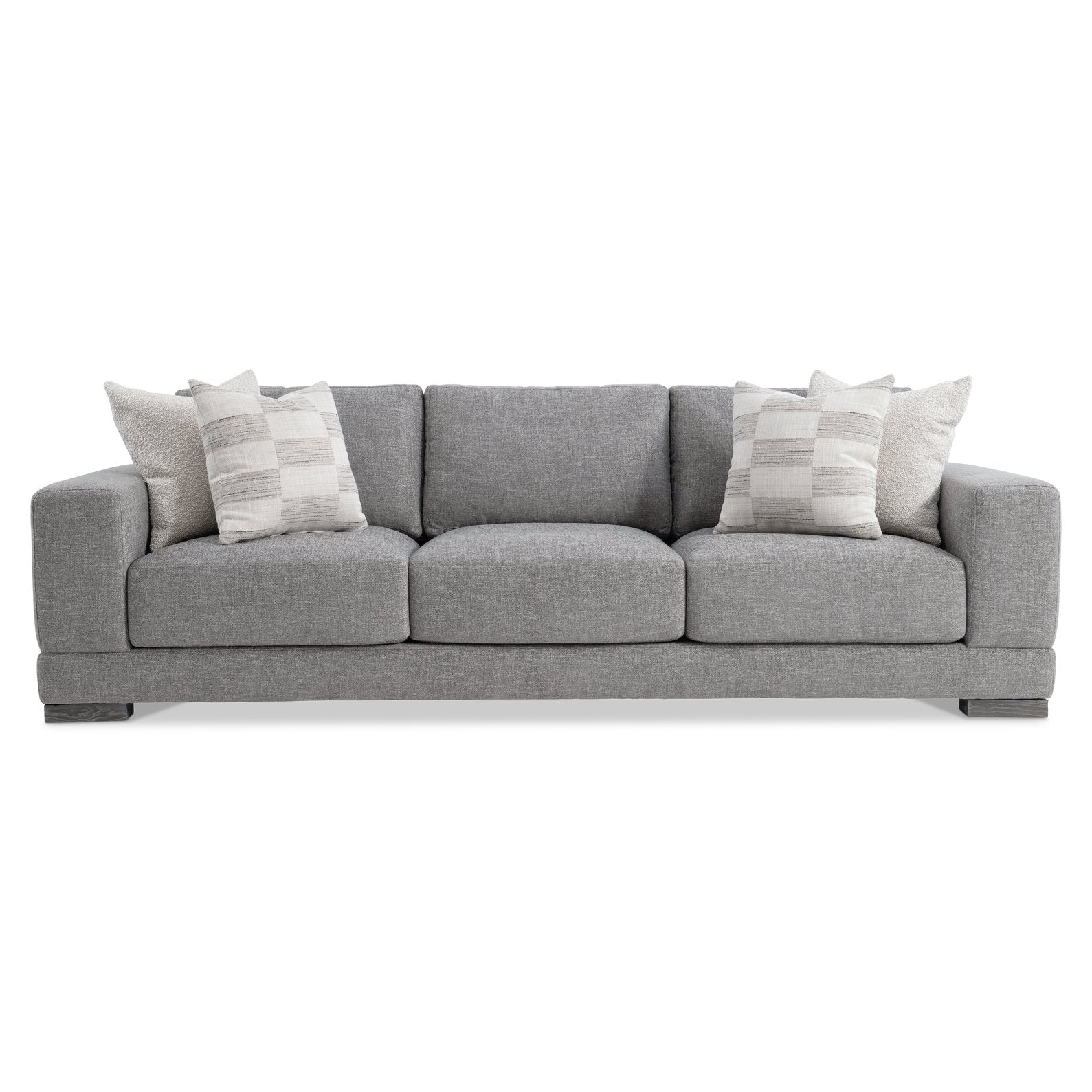 Experience contemporary comfort and refined craftsmanship with this made-to-order fabric sofa. Clean modern lines are balanced by gentle curves and generously padded cushions to create an inviting centerpiece for living rooms and lounge spaces. Thoughtful details—like weltless box-edge back pillows and wide block feet in textured wood—deliver a tailored yet relaxed look, while included throw pillows add immediate styling and comfort.