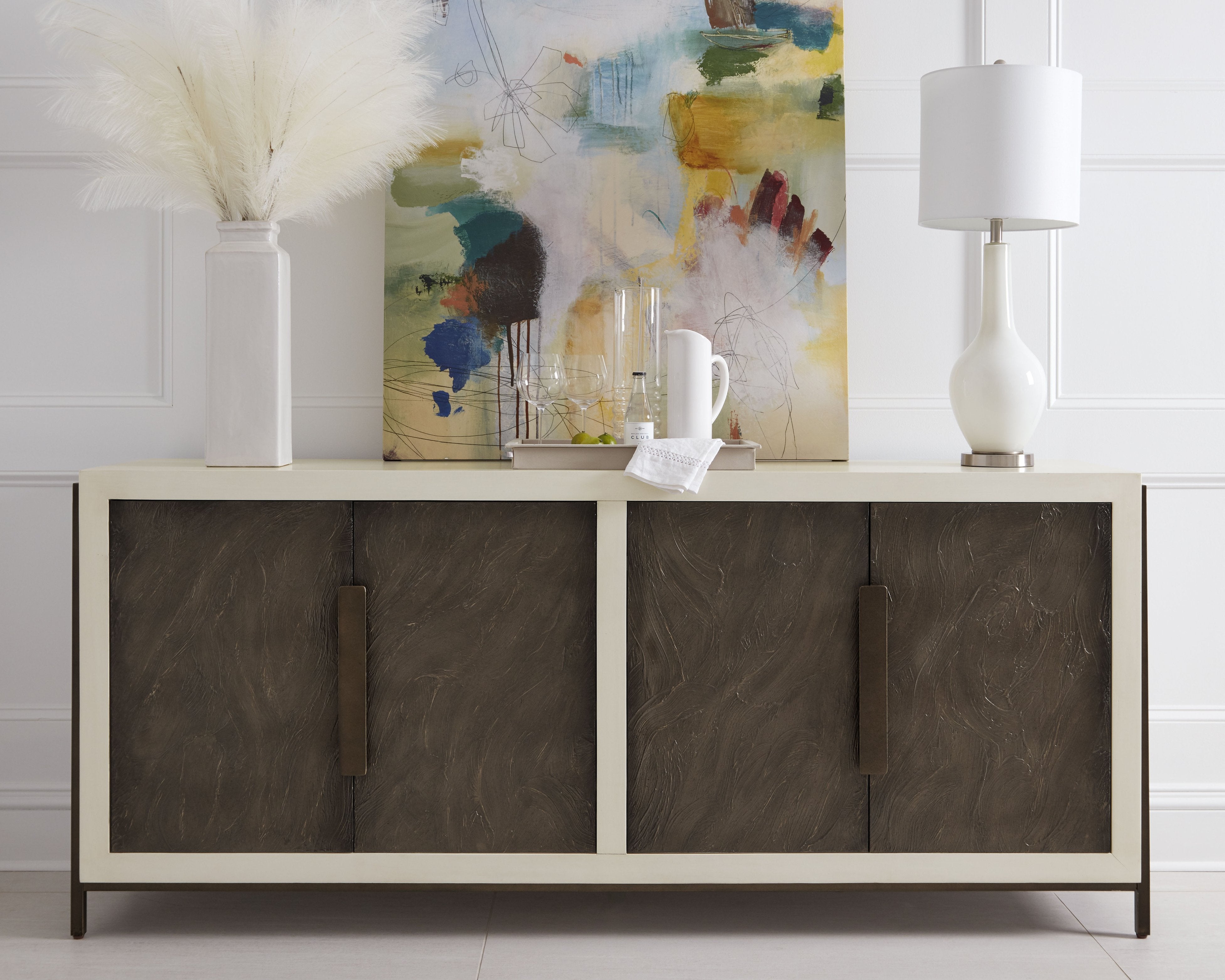 - Metal hardware, base, and frame finished in a burnished bronze finish