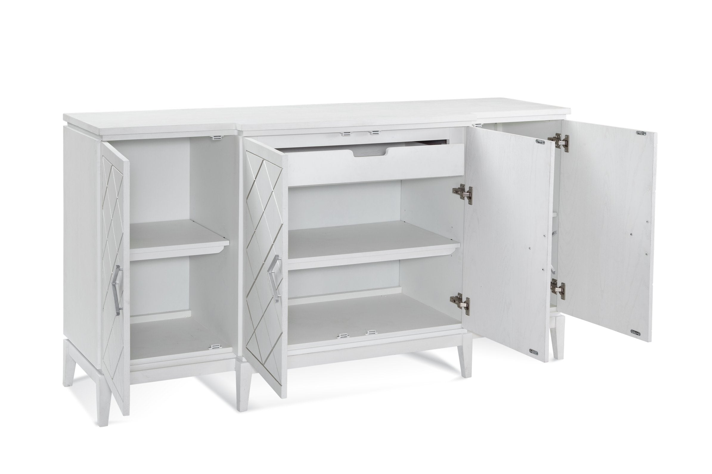 - Features silver routed diamond pattern with complementing hardware over a white flat cut oak veneer finish