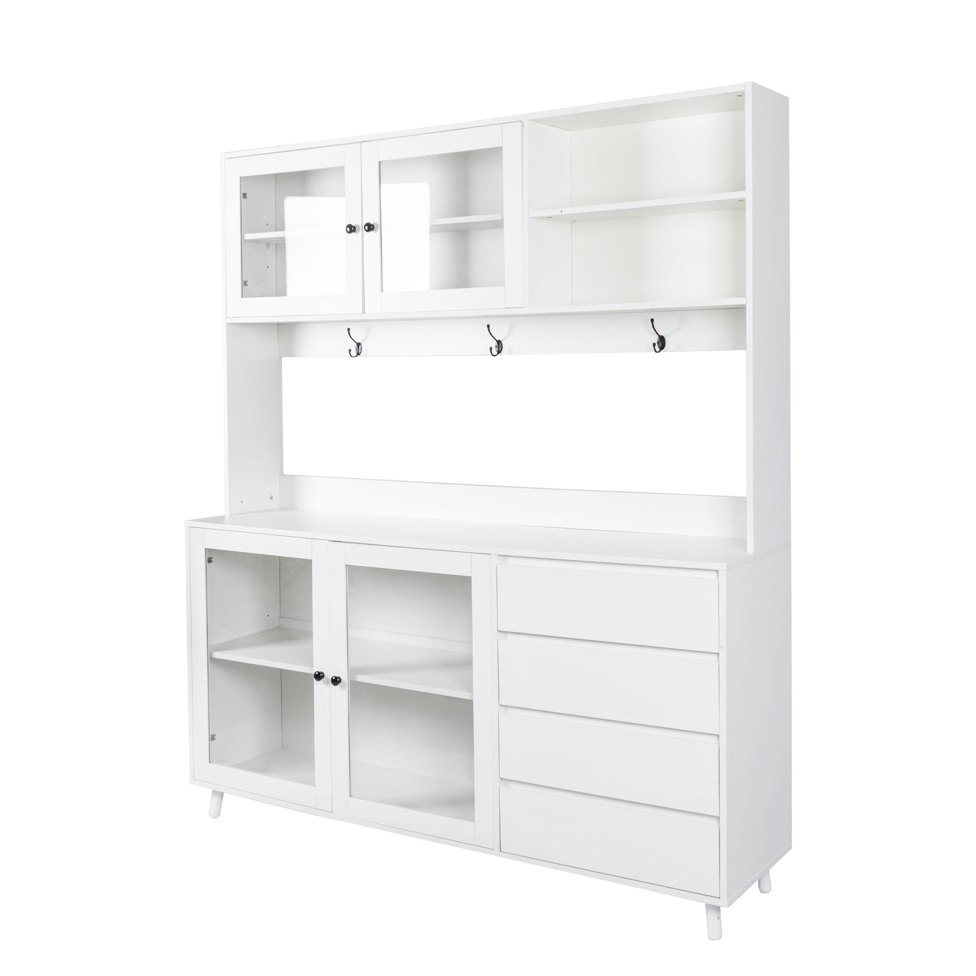 - This integrated kitchen hutch has added more practical storage solutions, including open and closed shelves,drawers, kitchenware hanging hooks and microwave tabletop; protect kitchen stuffs from dust. And the cable management allows to use microwaves and other kitchen appliance more easily