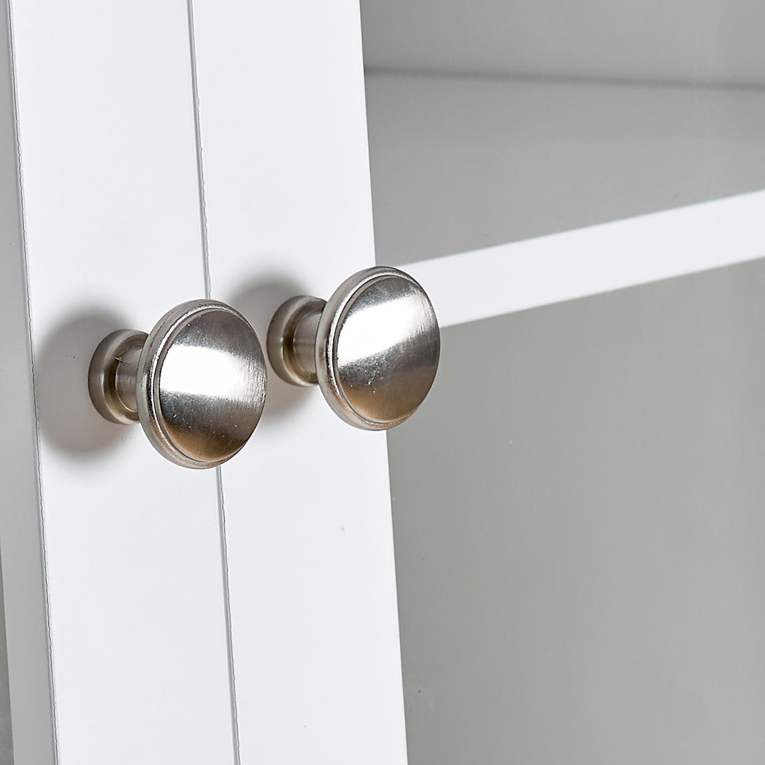 - Construction: Painted MDF with glass doors for a moisture-resistant surface suitable for kitchens, bathrooms, laundry rooms, and other high-humidity areas.