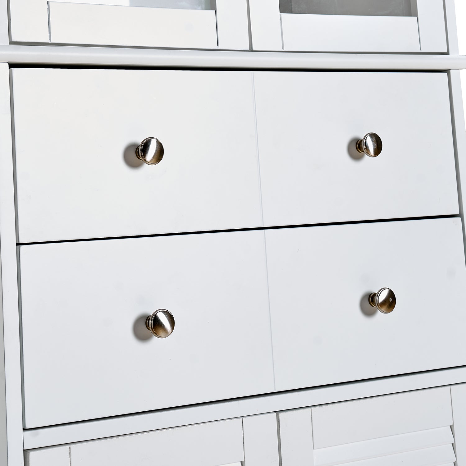 - Storage layout: Two glass-paneled doors reveal adjustable shelving for tall or short items; one smooth-sliding drawer provides easy access to snacks or utensils; bottom compartment stores bulkier items or small appliances.