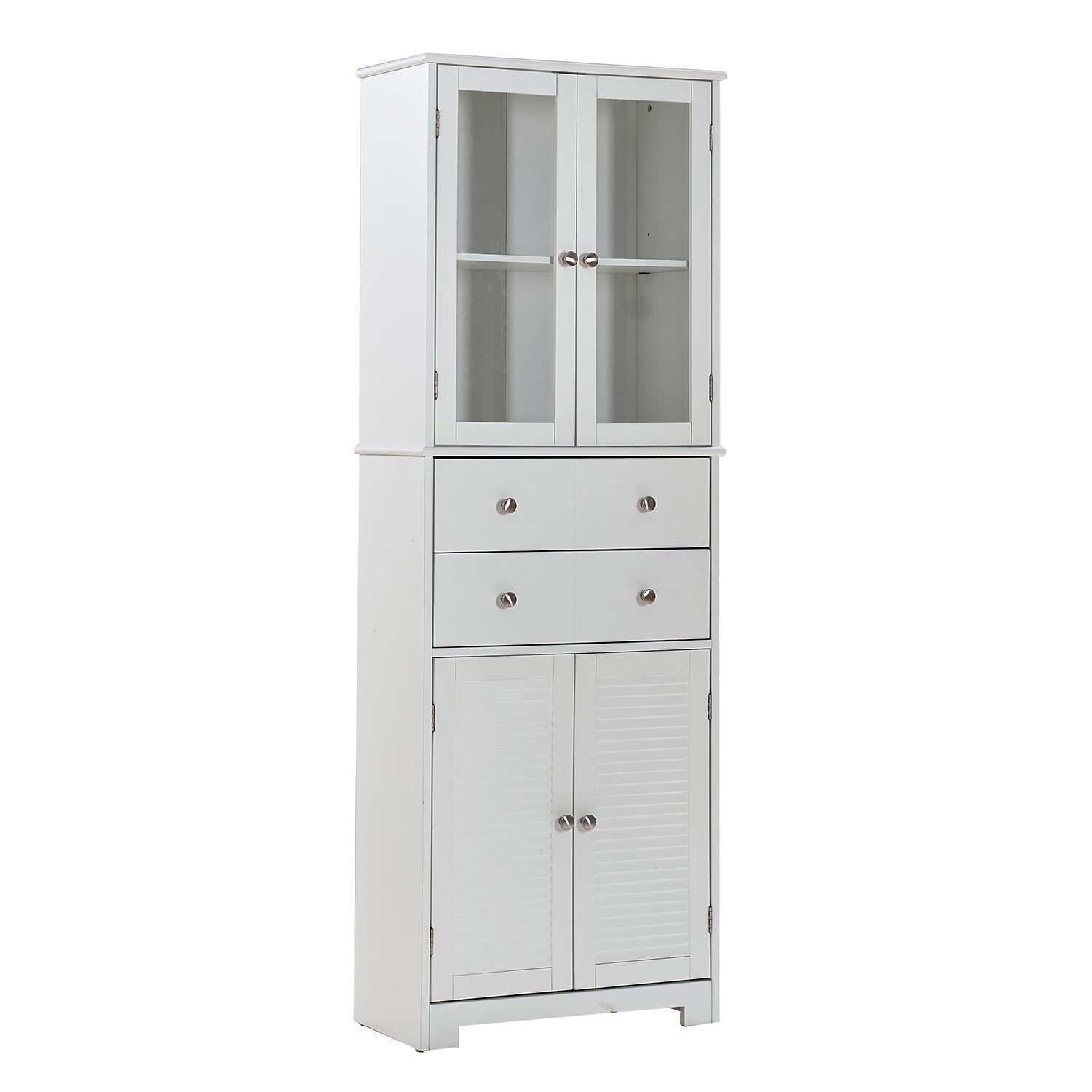 Give your kitchen, bathroom, or craft room a neat, organized upgrade with this tall white pantry cabinet—designed for versatile storage, durable construction, and a clean modern look. It combines closed and visible storage with a smooth-gliding drawer and adjustable shelving so you can store pantry staples, small appliances, linens, or craft supplies with ease.