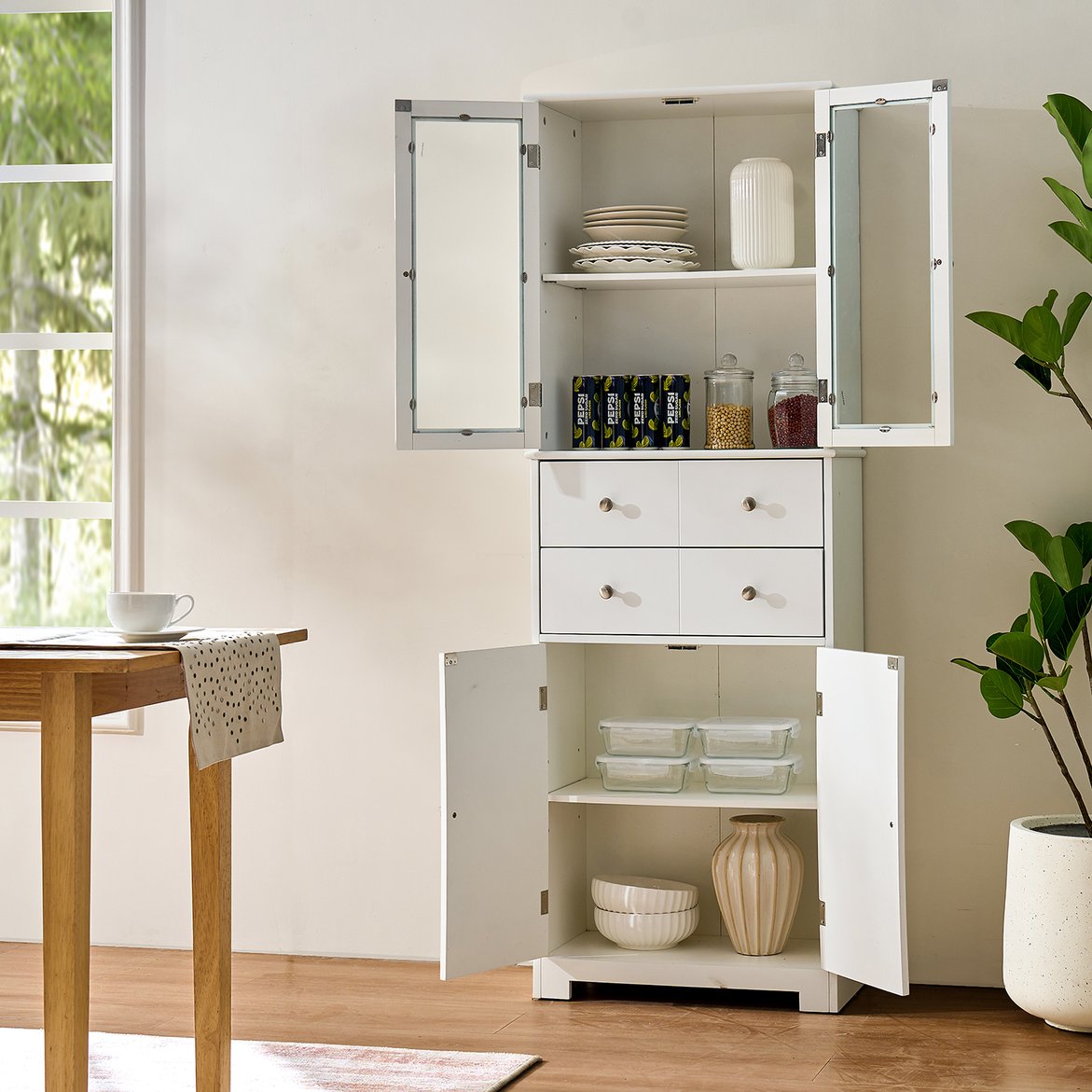 - Large Storage Capacity : The spacious kitchen pantry cabinet is designed to cater to your unique storage needs. This cabinet is perfect for storing teas, coffees, fruit powders, cereals, rolls, and chips in the top section, small snack packs and dips in the drawer, and gluten-free foods, ingredients, cookware, or small appliances in the bottom compartment