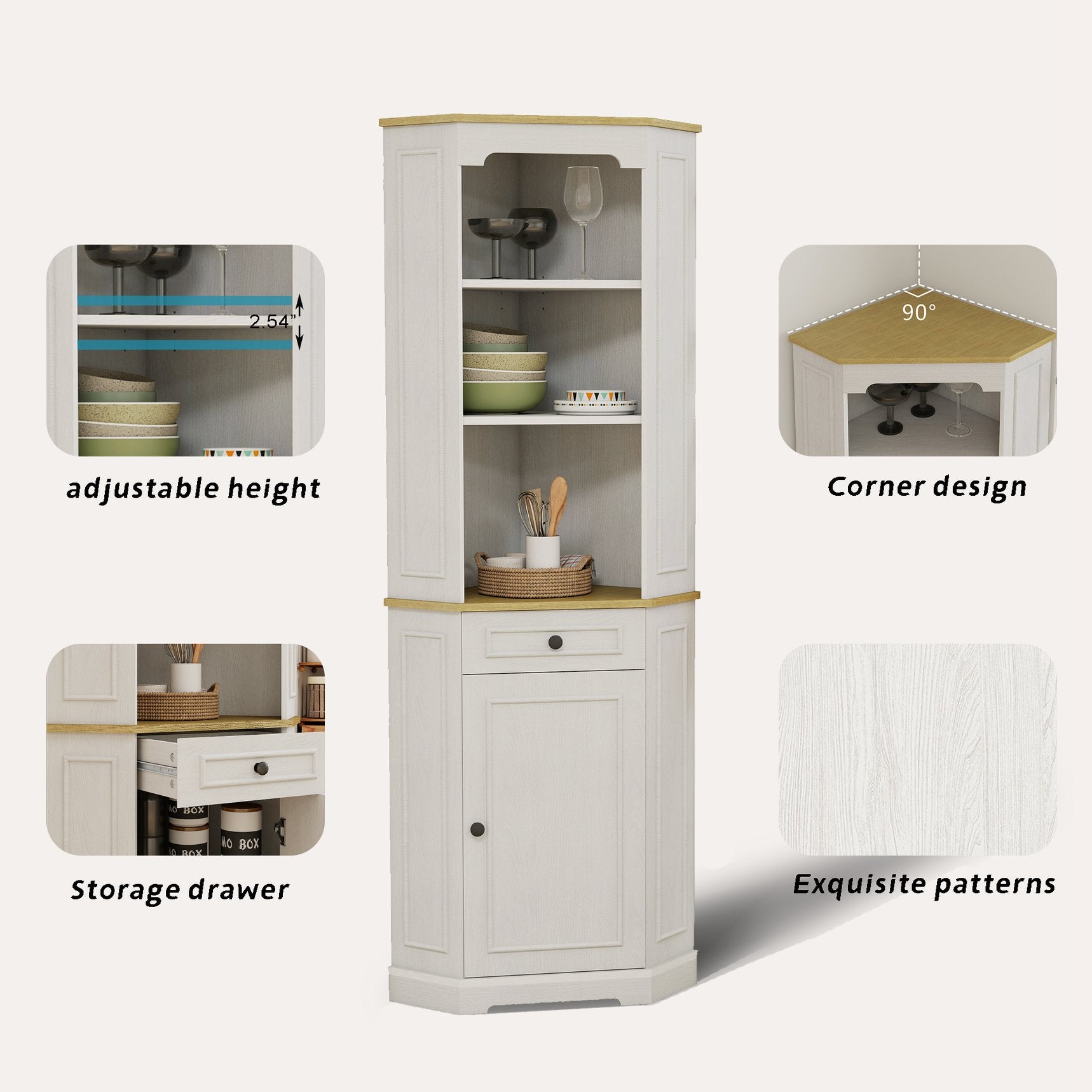 - Ample storage space and Space Saving: With its 90° right-angle corner design, this corner cabinet makes the most out of those underutilized spaces. It features 1 door, 1 drawer and 5 layers storage shelves, including 1 adjustable top shelf, providing you with the flexibility to store a variety of items, delivers generous storage while taking up minimal floor space—ideal for tight corners and narrow areas.