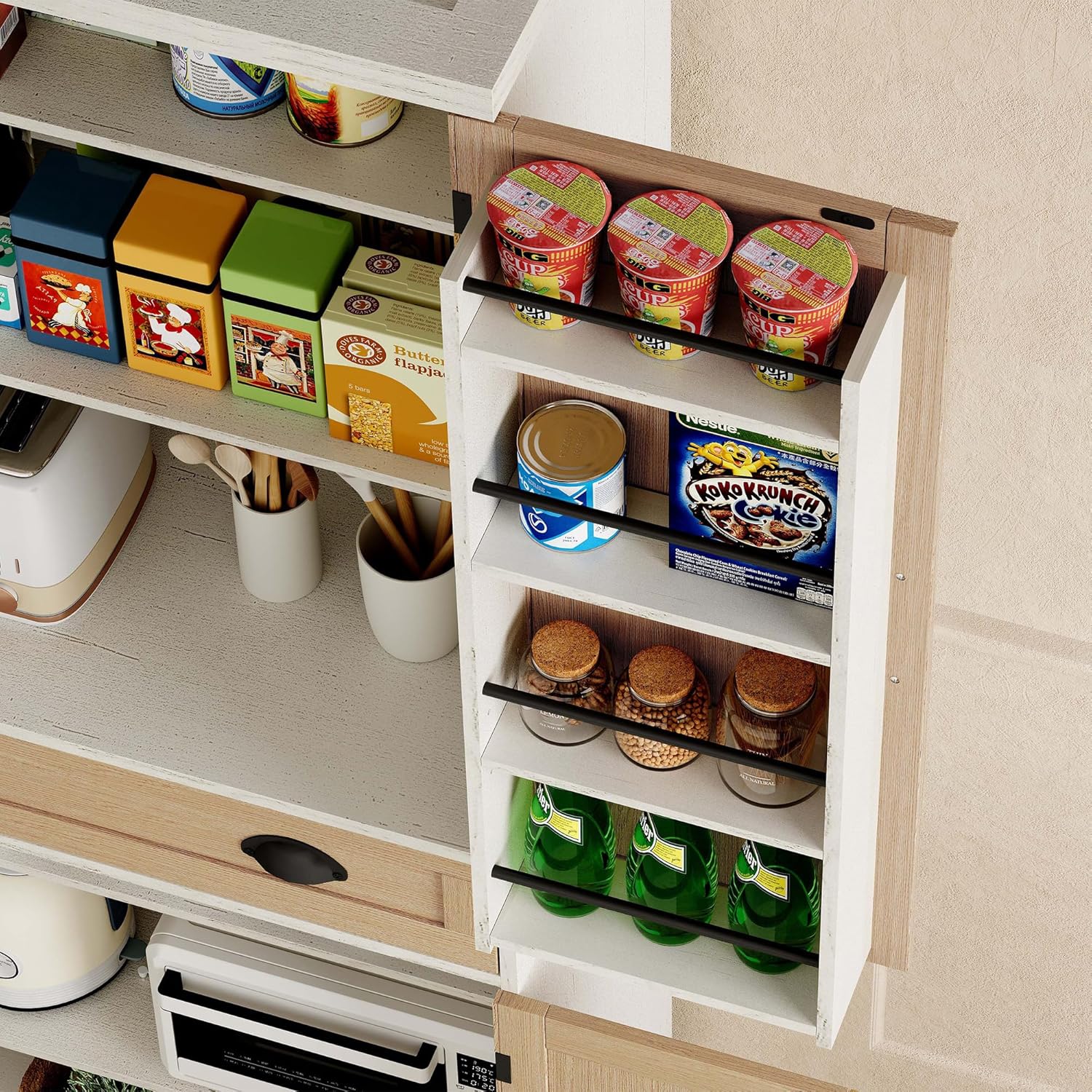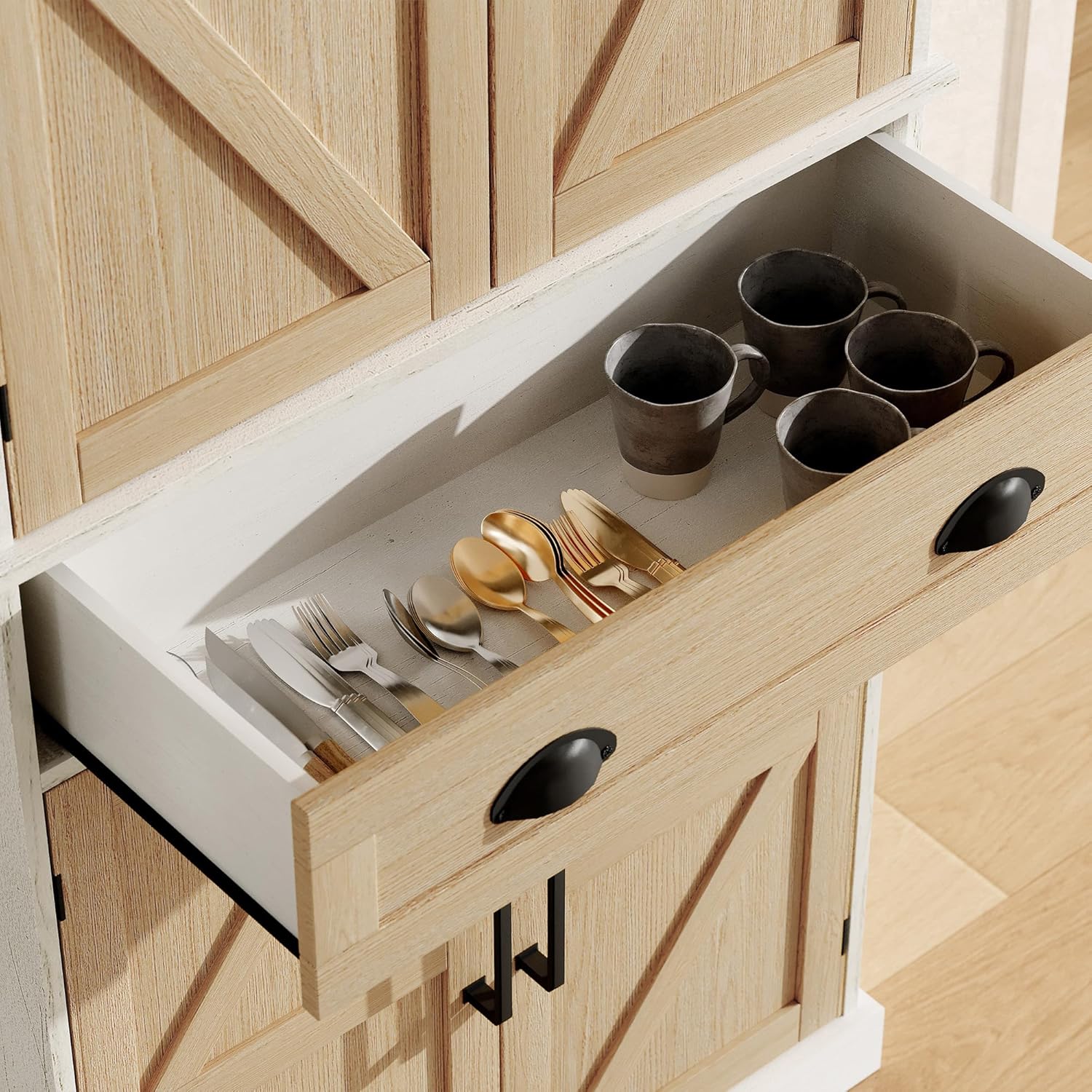 Bring farmhouse charm and practical organization to your home with this tall freestanding pantry. Its rustic dark top contrasts a pristine white body and X-paneled doors for a vintage look, while adjustable shelving, door-mounted racks and a smooth-glide drawer give flexible storage for kitchenware, pantry staples or household essentials. Constructed from durable MDF and equipped with an anti-tip kit, this cabinet balances style, function and safety for kitchens, dining areas or living rooms.