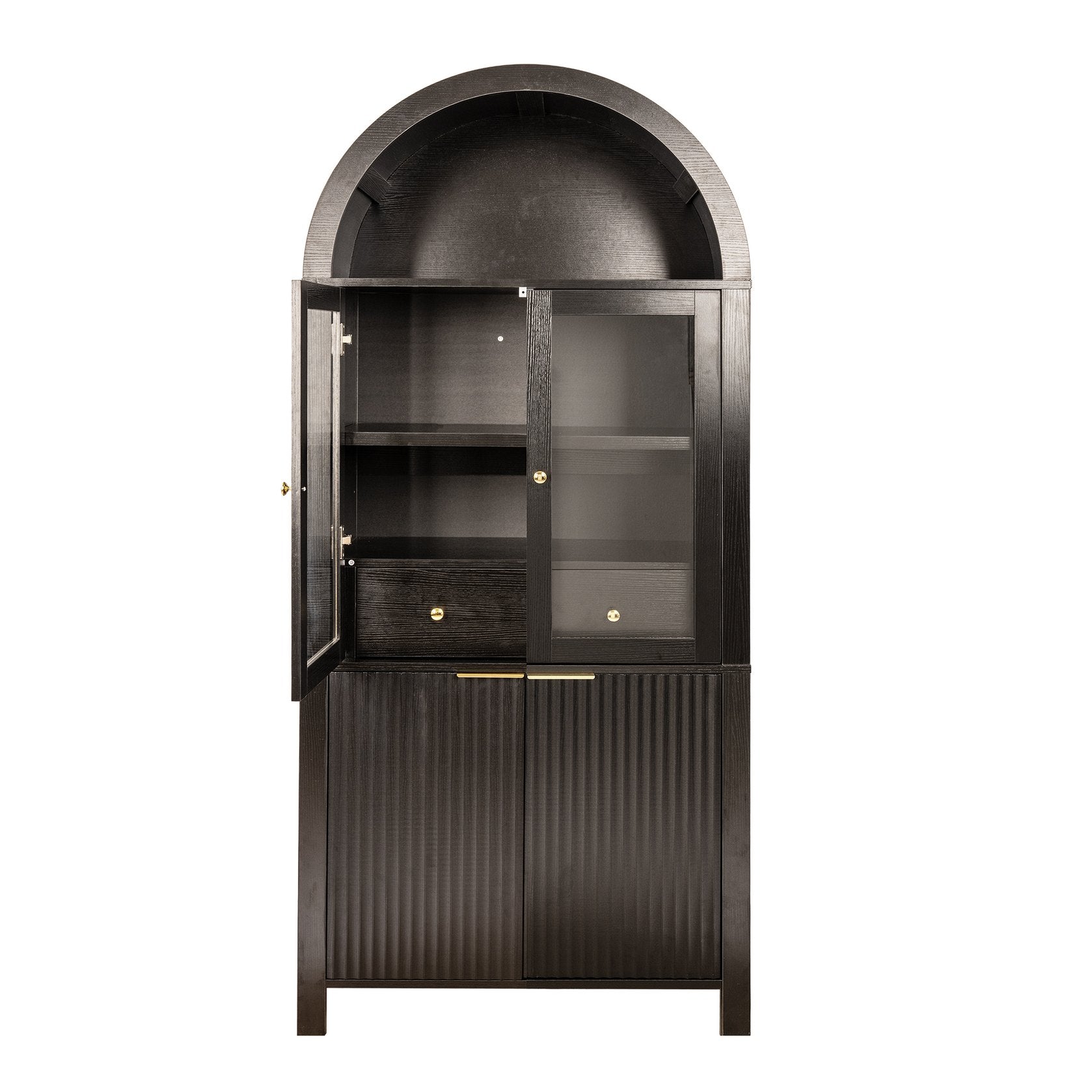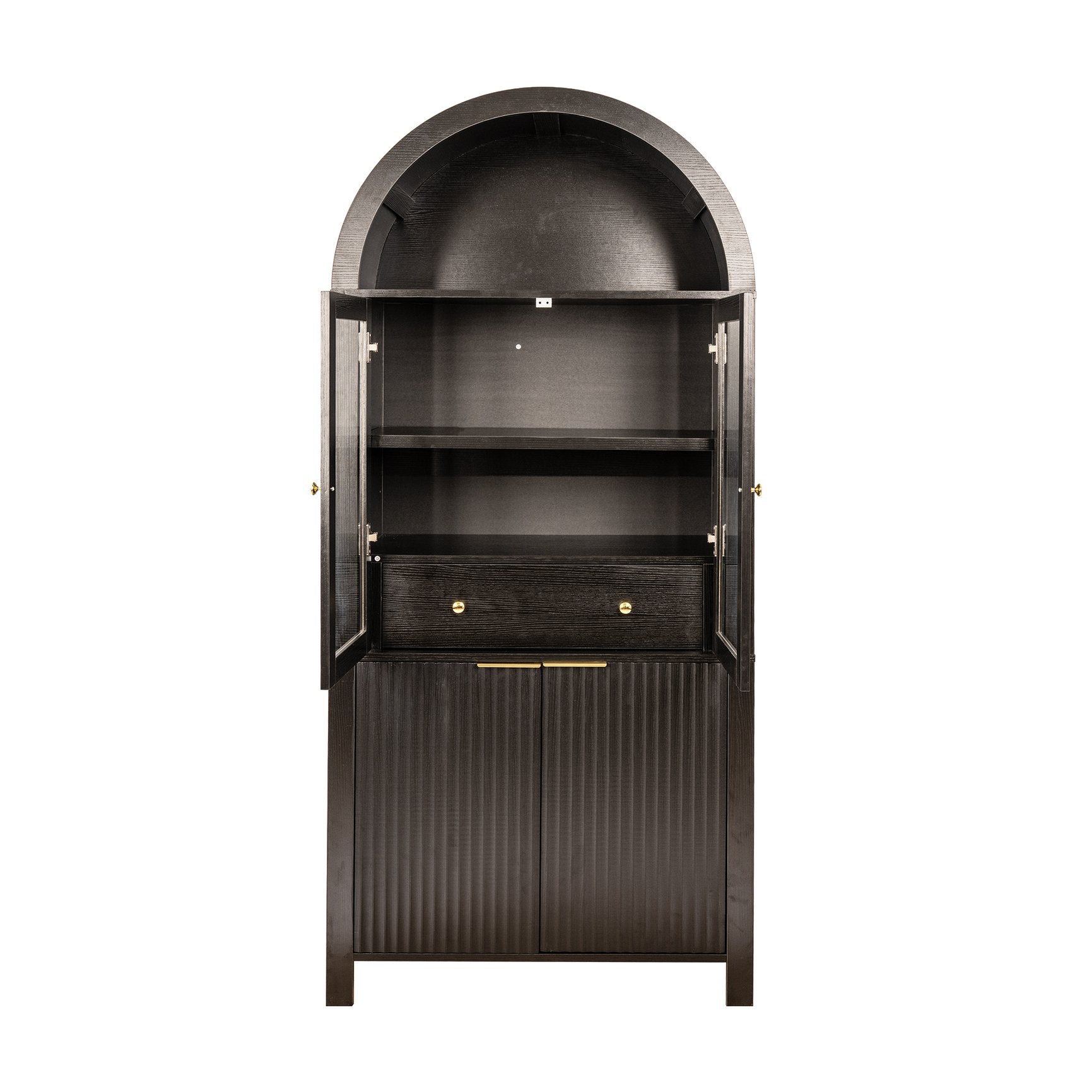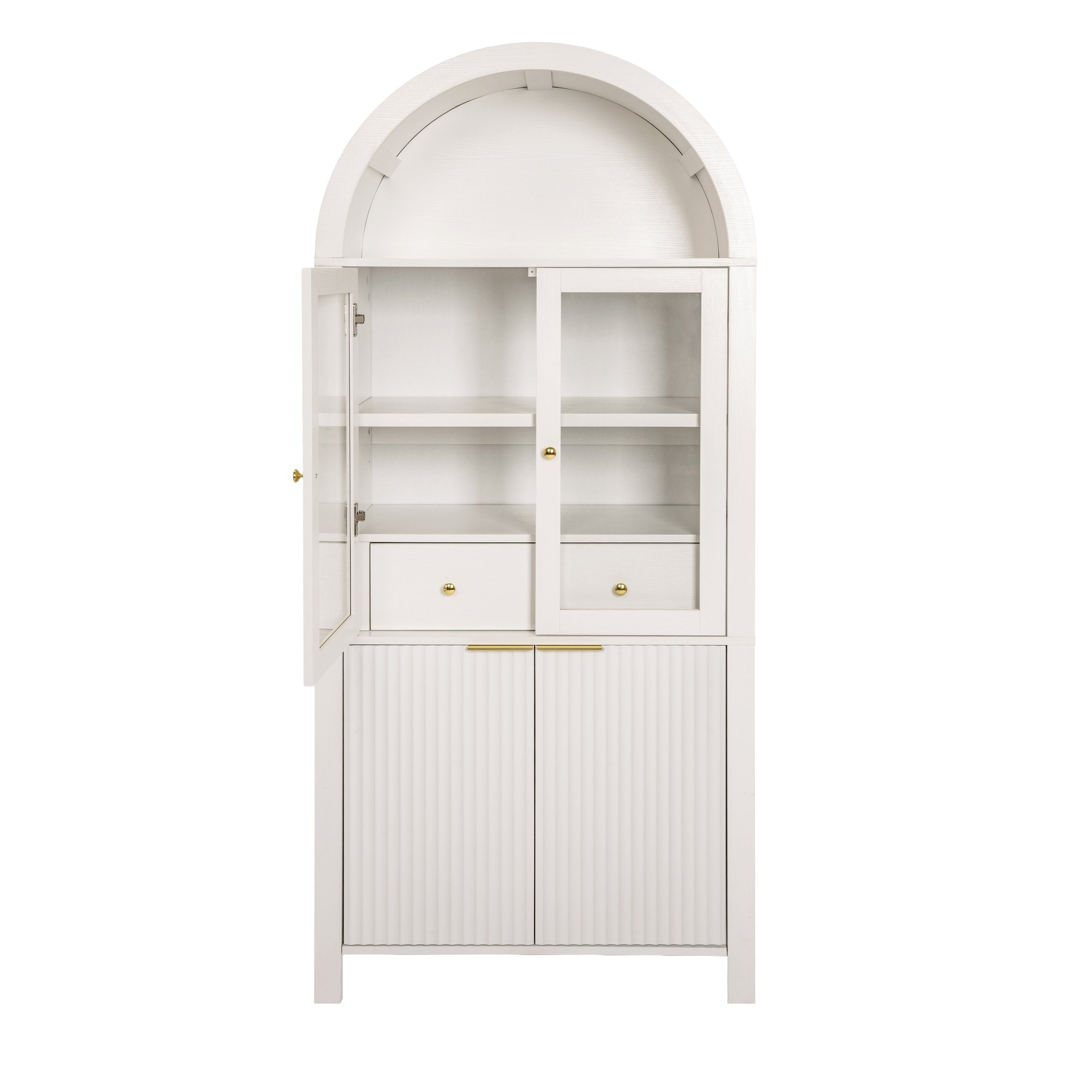 Bring refined organization and timeless style to your kitchen, dining room, or living area with this tall arched pantry cabinet. Combining elegant fluted detailing, a glass-front display door, a hidden drawer and adjustable shelving, it offers a versatile storage solution that balances display and concealed storage. Built for daily use with sturdy hardware and safety features, this cabinet keeps essentials accessible while elevating your room’s look.