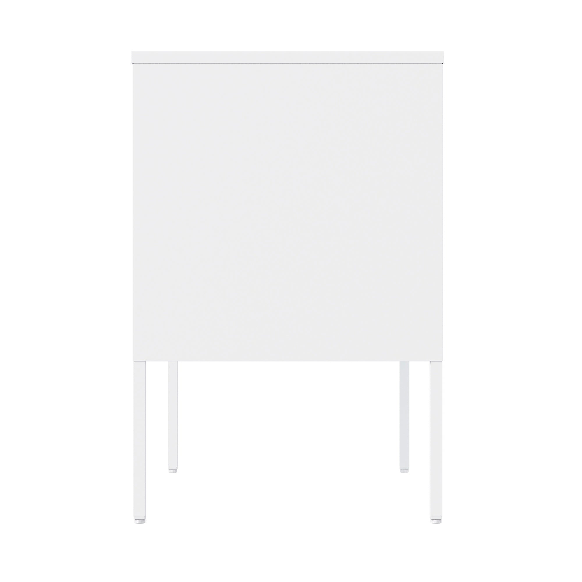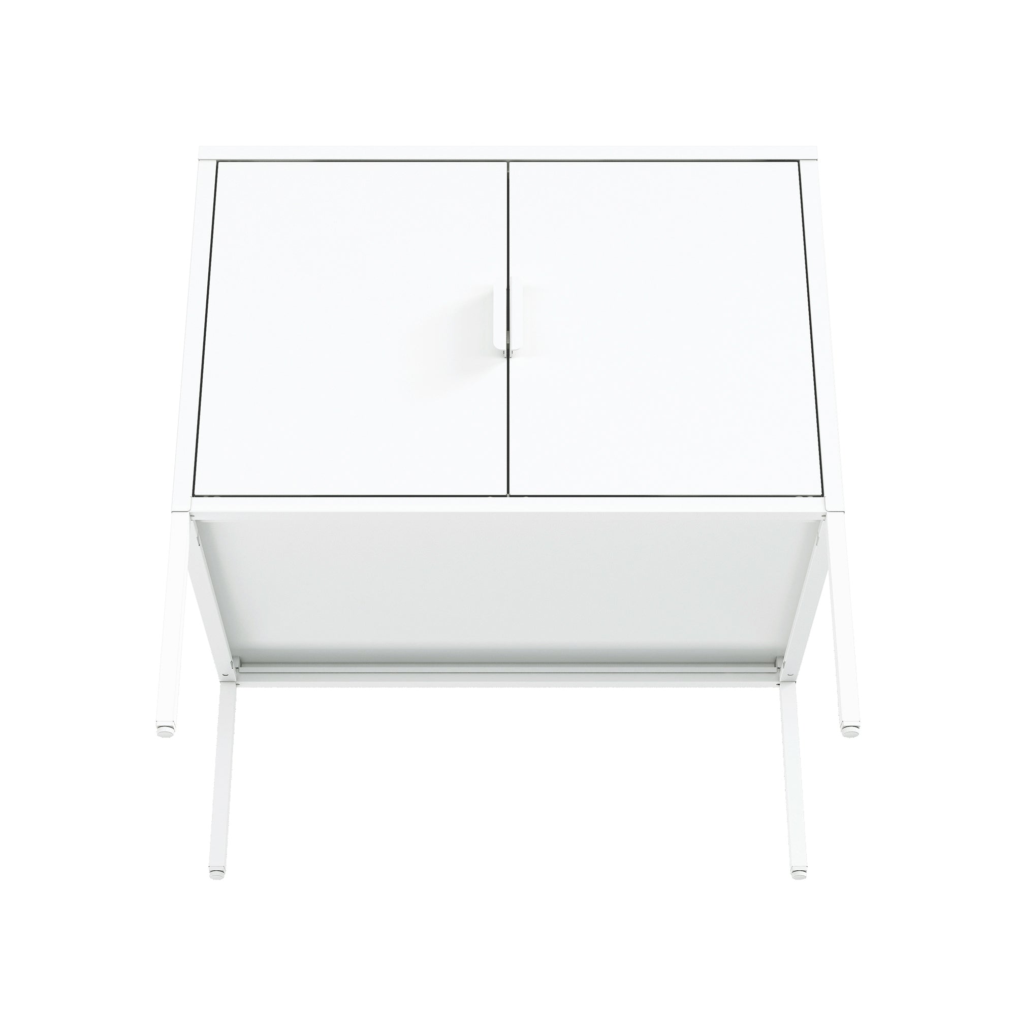 - Doors & Handles: Two standard metal doors with vertical metal handles conceal storage and maintain a seamless, minimalist appearance.