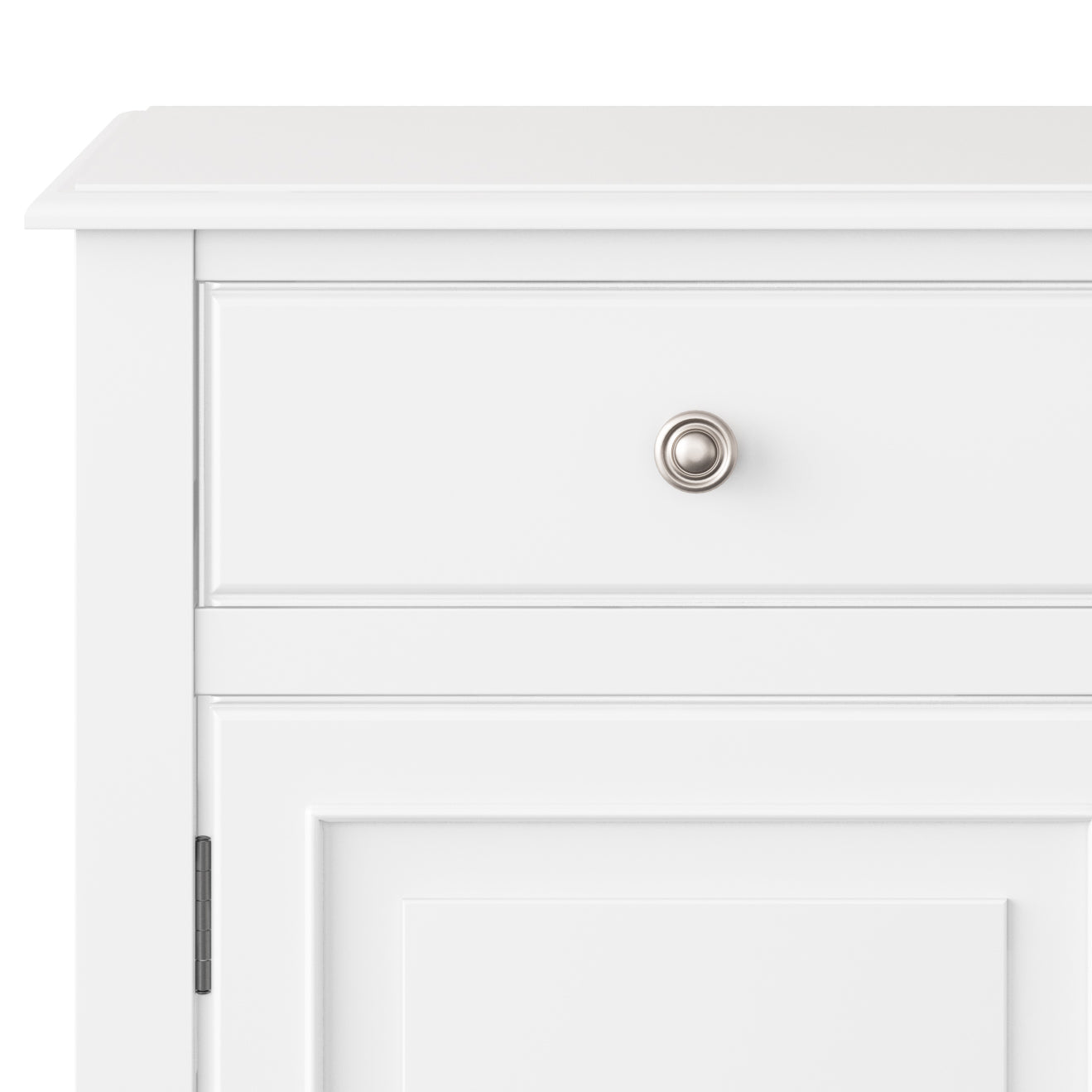Bring timeless British Colonial charm to your entryway with this handcrafted solid wood storage cabinet in a clean white finish. Perfect for organizing keys, gloves, and everyday essentials while providing generous concealed storage, its vintage raised panels, notched legs, and brushed nickel hardware make it a stylish yet practical addition to your living room, bedroom, dining room, condo, or office.