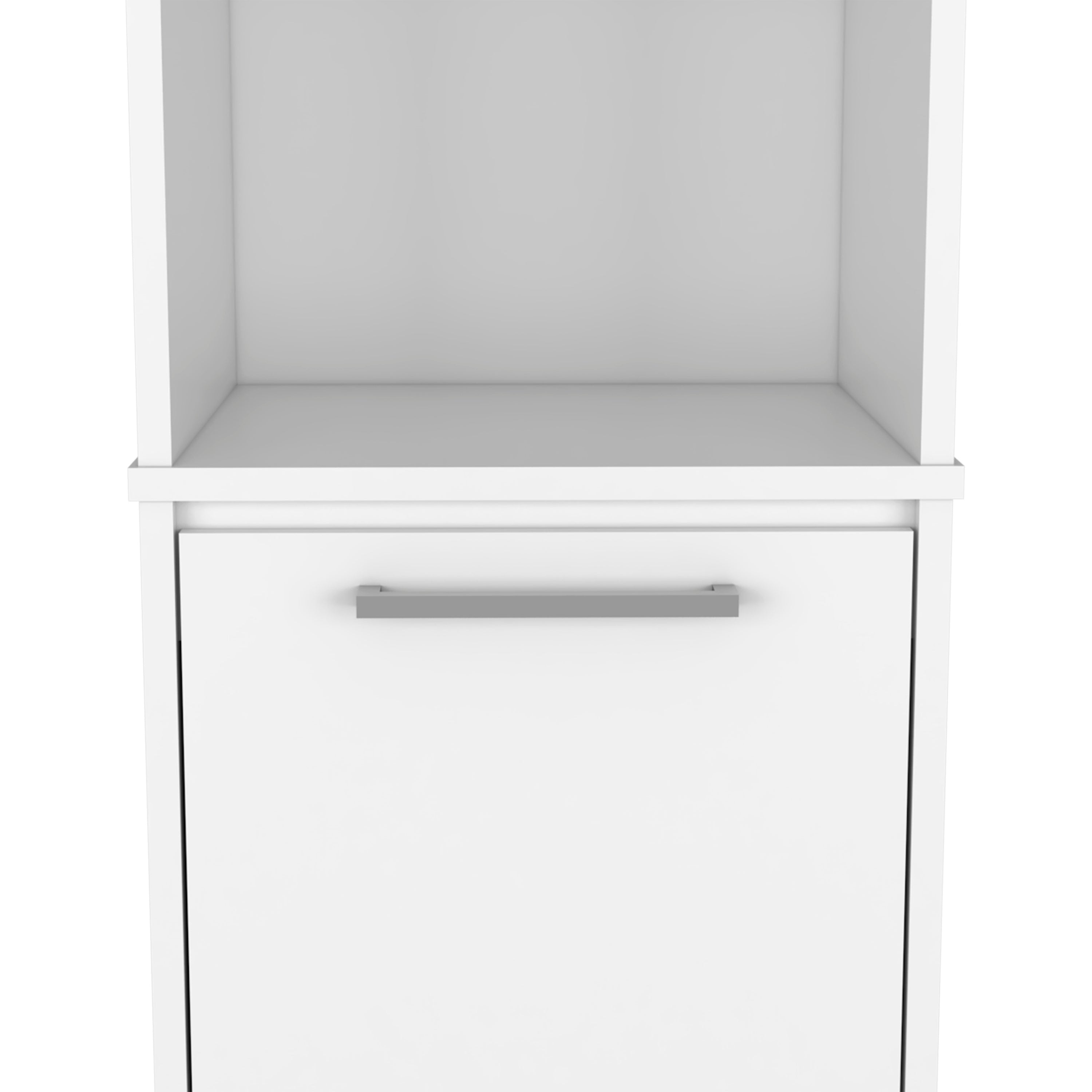 Give your kitchen a clean, modern storage solution with this space-saving pantry cabinet. Designed for compact areas, it combines open shelving for display and quick access with a closed cabinet for concealed storage. Durable particle board construction and soft-close hinges offer everyday usability with a polished look.