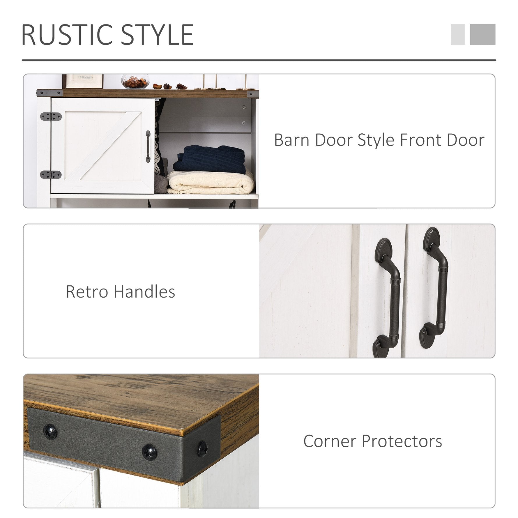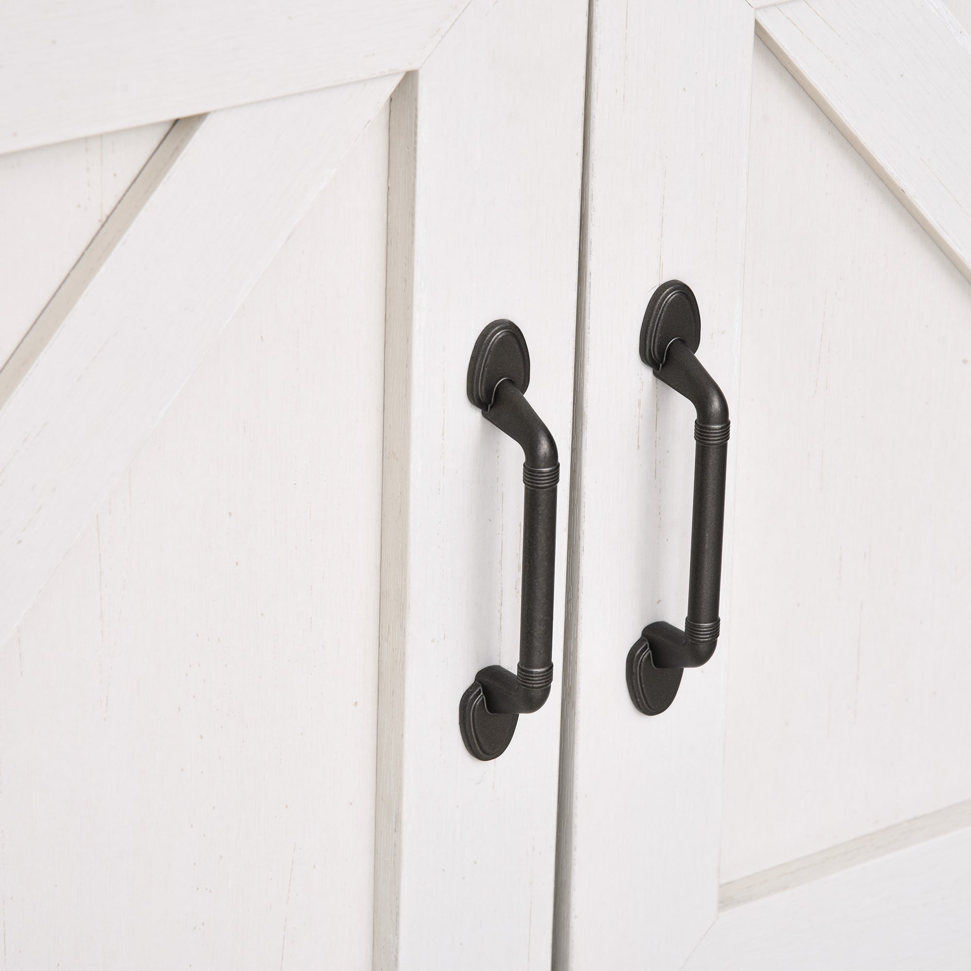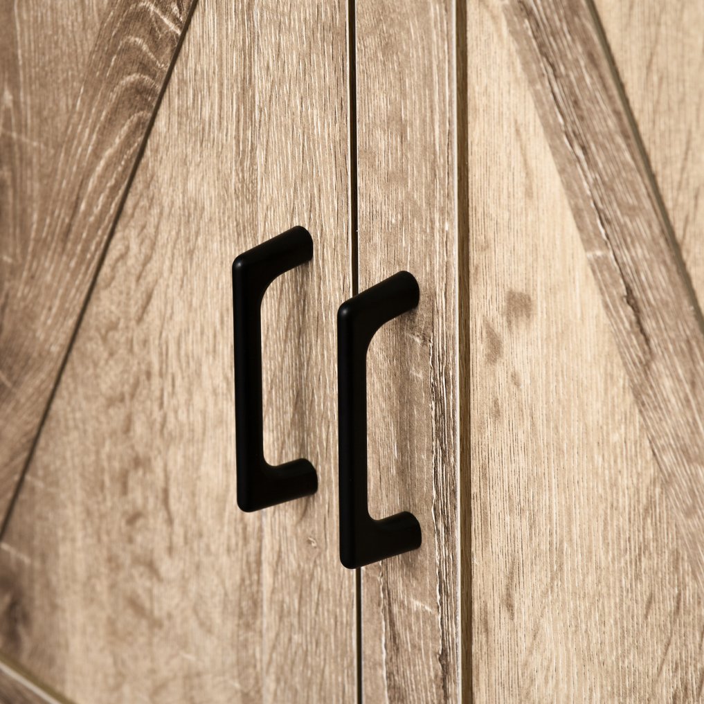 - Style: Farmhouse/industrial aesthetic with barn-door design, visible wood grain veneer, and outward black hinges for authentic character.