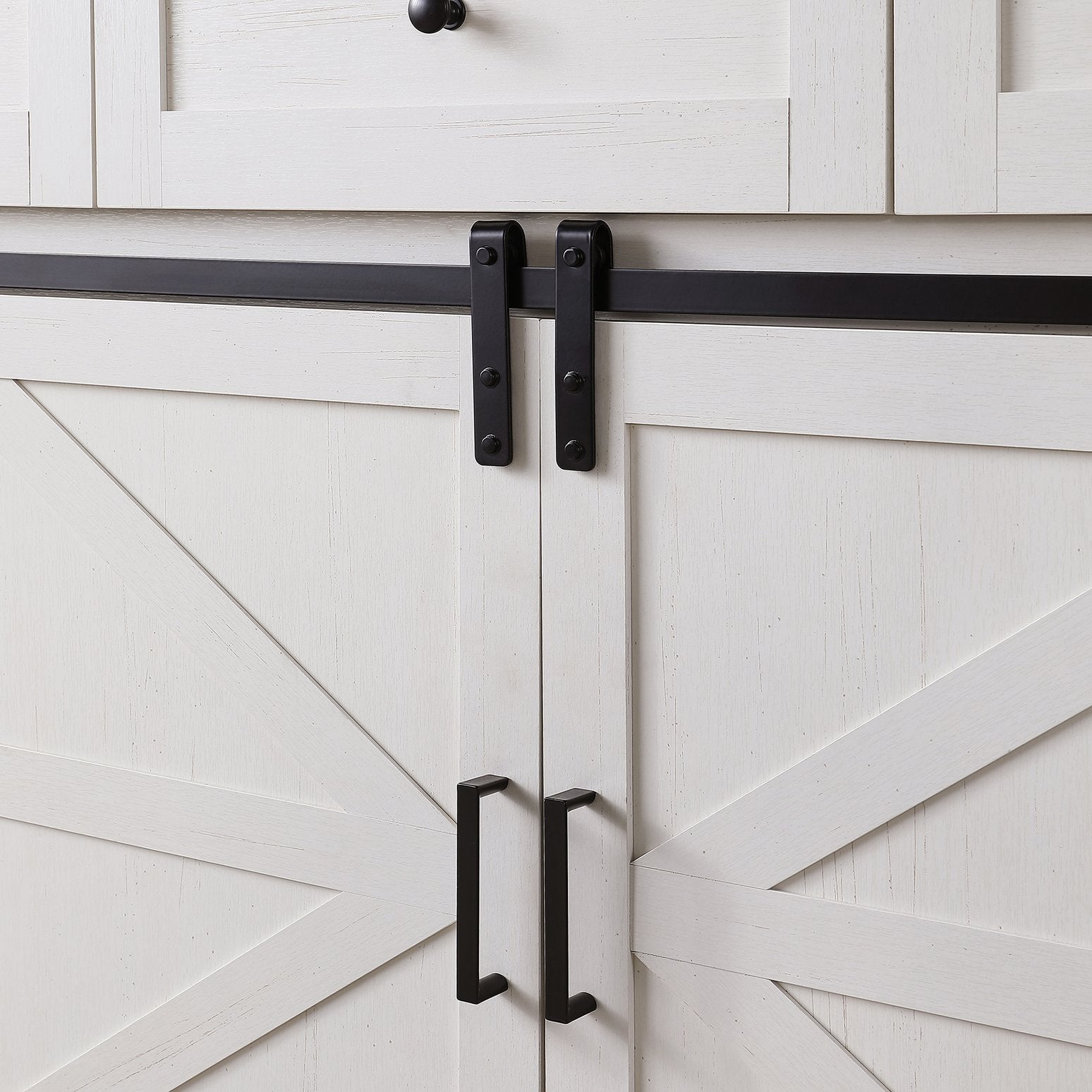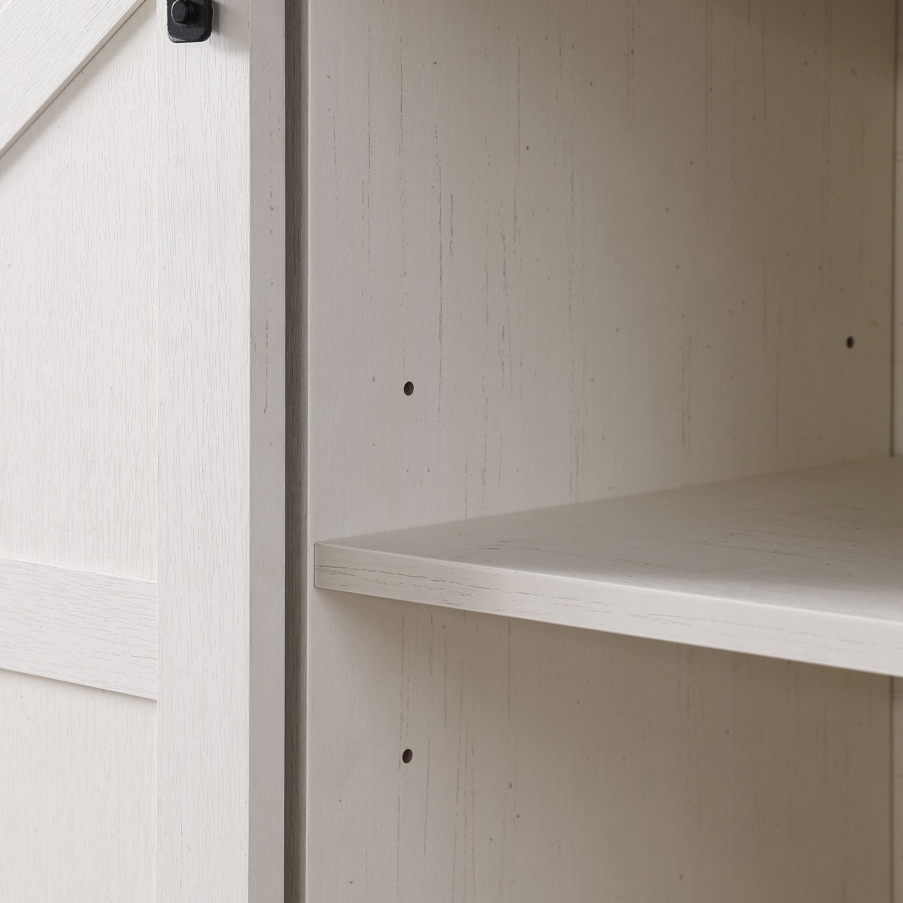 - Sliding barn door: Rustic-style sliding door hides or reveals storage areas while adding farmhouse character and saving space compared with hinged doors.