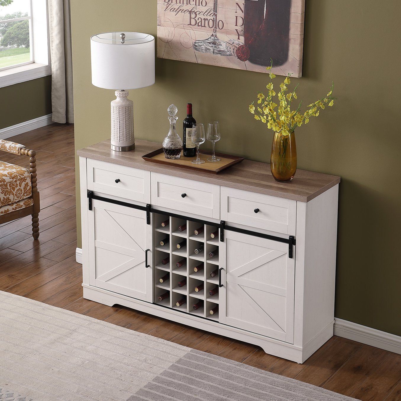 Bring rustic farmhouse charm and smart organization to your dining room or kitchen with this spacious, antique-white wine bar cabinet. Thoughtfully designed for both form and function, it combines secure wine storage, ample shelving, and smooth drawers with a durable top surface — perfect as a coffee bar, buffet, or entertaining station.