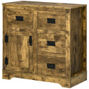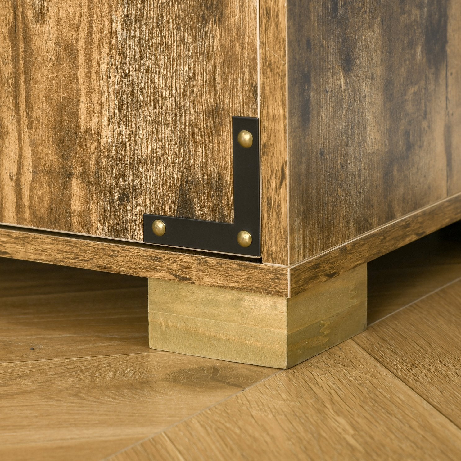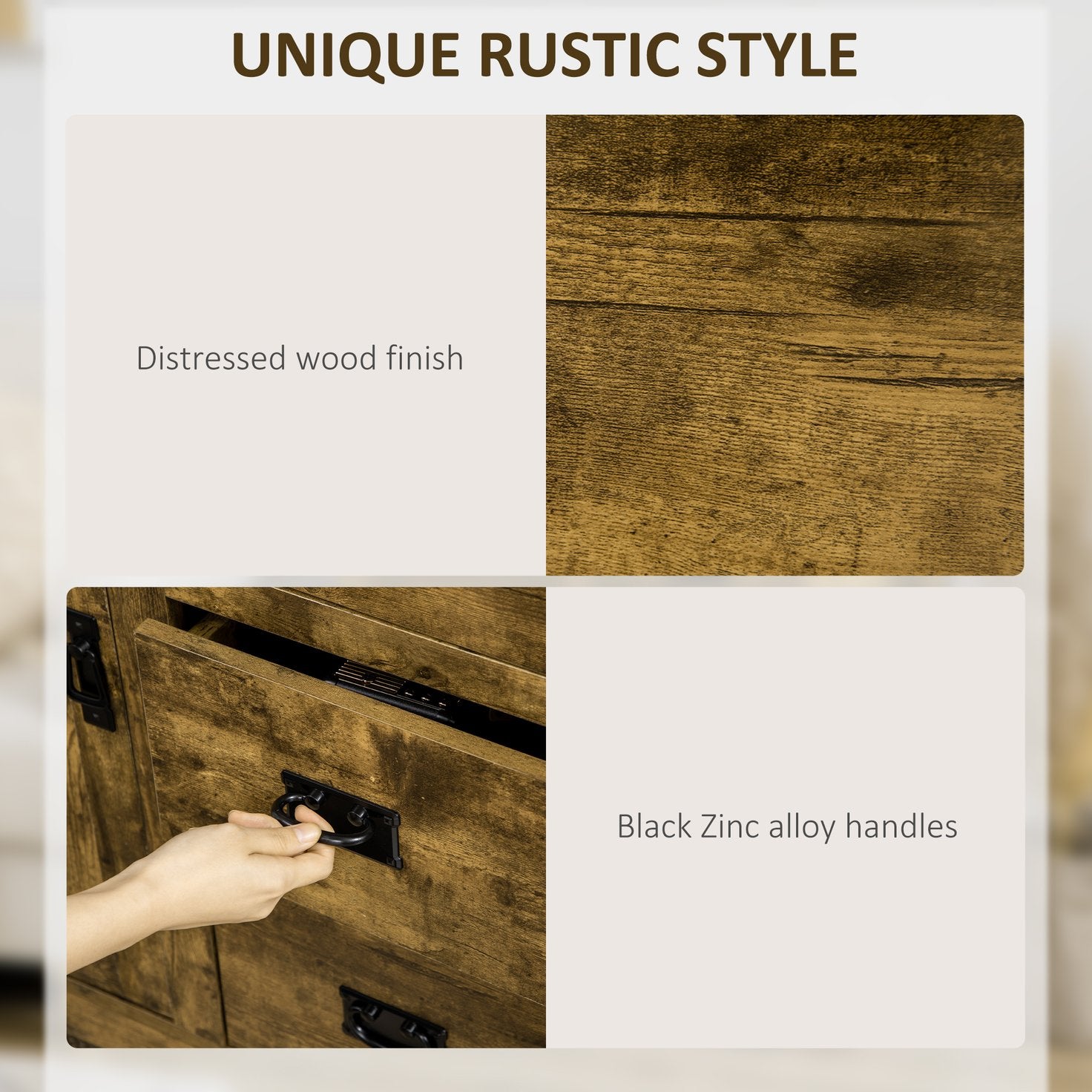 Bring rustic charm and practical storage to your home with this industrial-style sideboard. Finished in distressed brown with vintage metal hardware, it works as a coffee bar, dining room buffet, entryway console, or extra kitchen storage. Thoughtfully organized with drawers, an adjustable shelf, and a flat tabletop, this compact cabinet keeps essentials tidy while adding character to your space.