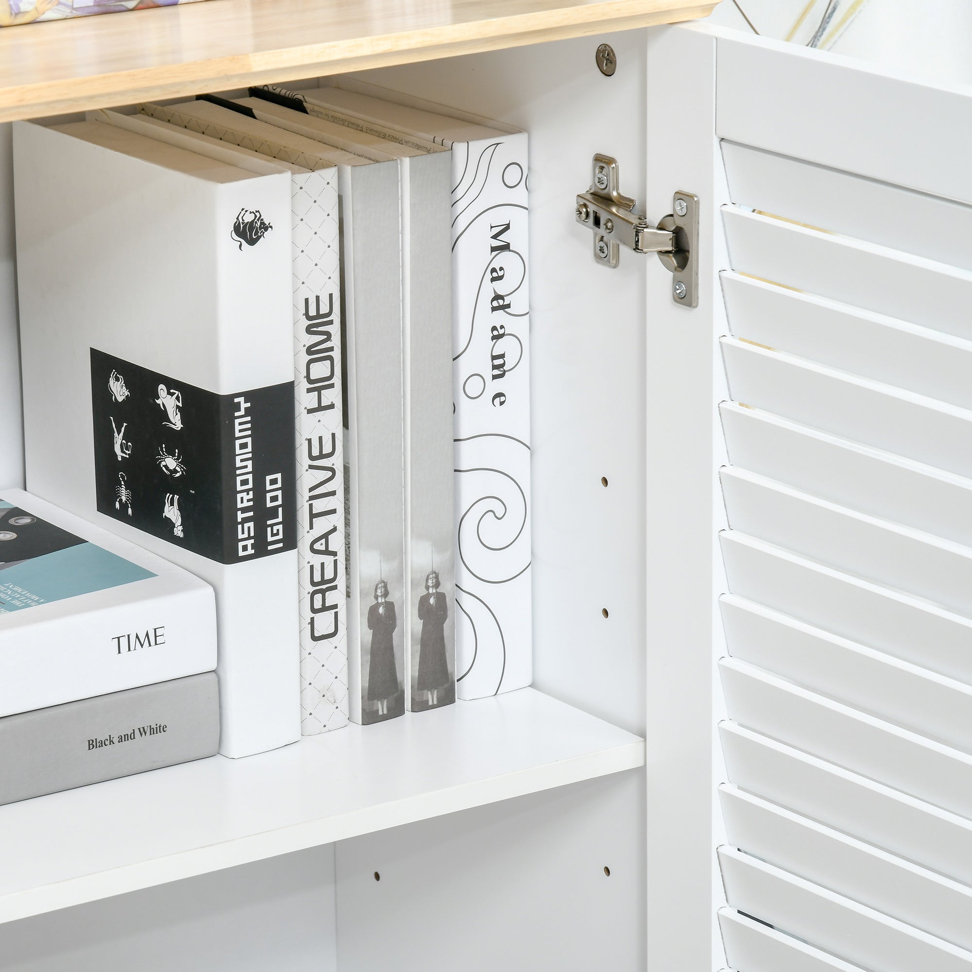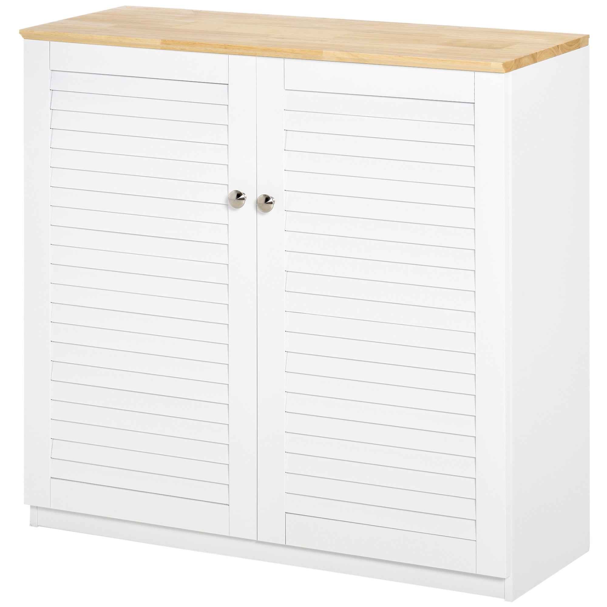 Organize your kitchen, dining room, or hallway with this versatile HOMCOM sideboard that combines classic louvered styling with practical storage. Its clean white frame and natural rubberwood top create a timeless look while the adjustable interior shelf and enclosed doors keep clutter out of sight. Built for everyday use, it offers a sturdy surface for serving, display, or a coffee bar and includes safety features for peace of mind.
