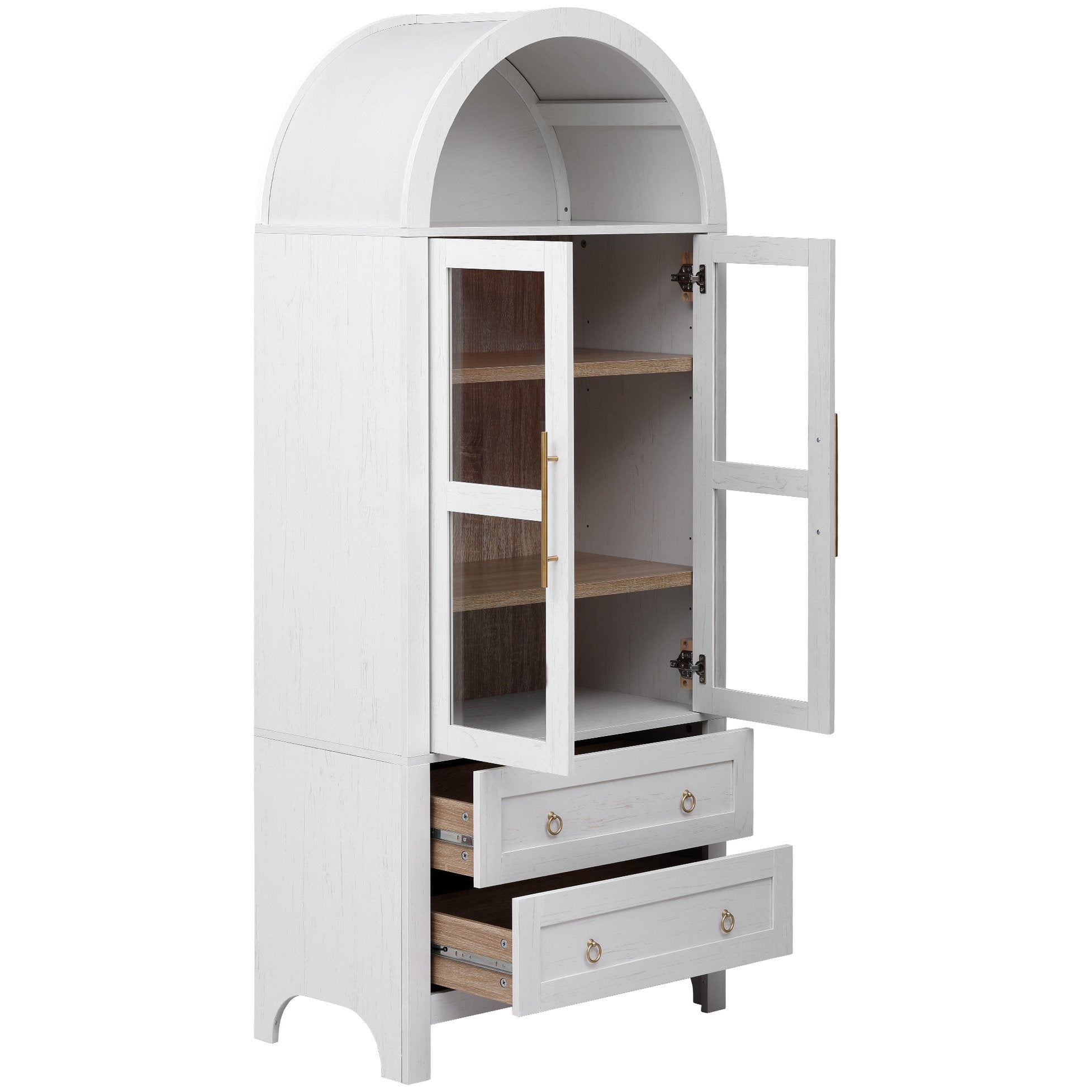 Bring effortless farmhouse charm and functional storage to your kitchen, dining room, or living space with this tall arched pantry cabinet. Designed to balance elegant style and everyday utility, it features a graceful arched top, clear glass doors for display, two large drawers for concealed storage, and adjustable shelving to accommodate dishes, pantry items, or decorative pieces. Built with smooth metal slides, soft-close hinges, and an anti-tip kit, this cabinet delivers quiet, secure performance and lasting durability.