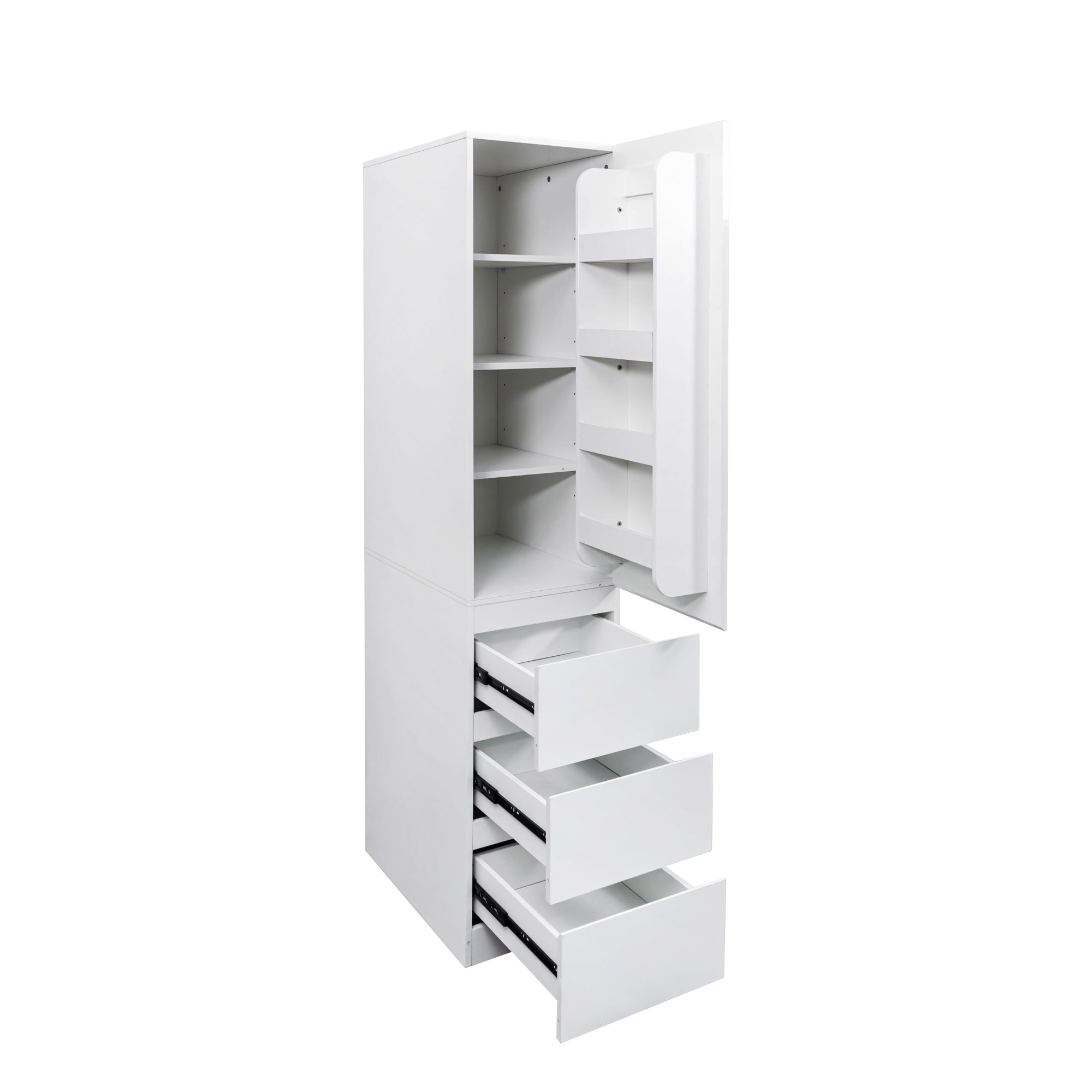 - This pantry cabinet offers ample visible and hidden storage, tidying kitchen clutter. Perfect for kitchen supplies and snacks. Designed for practicality, the cabinet boasts 3 shelves,4 door shelves, and three smooth-gliding drawers for added convenience