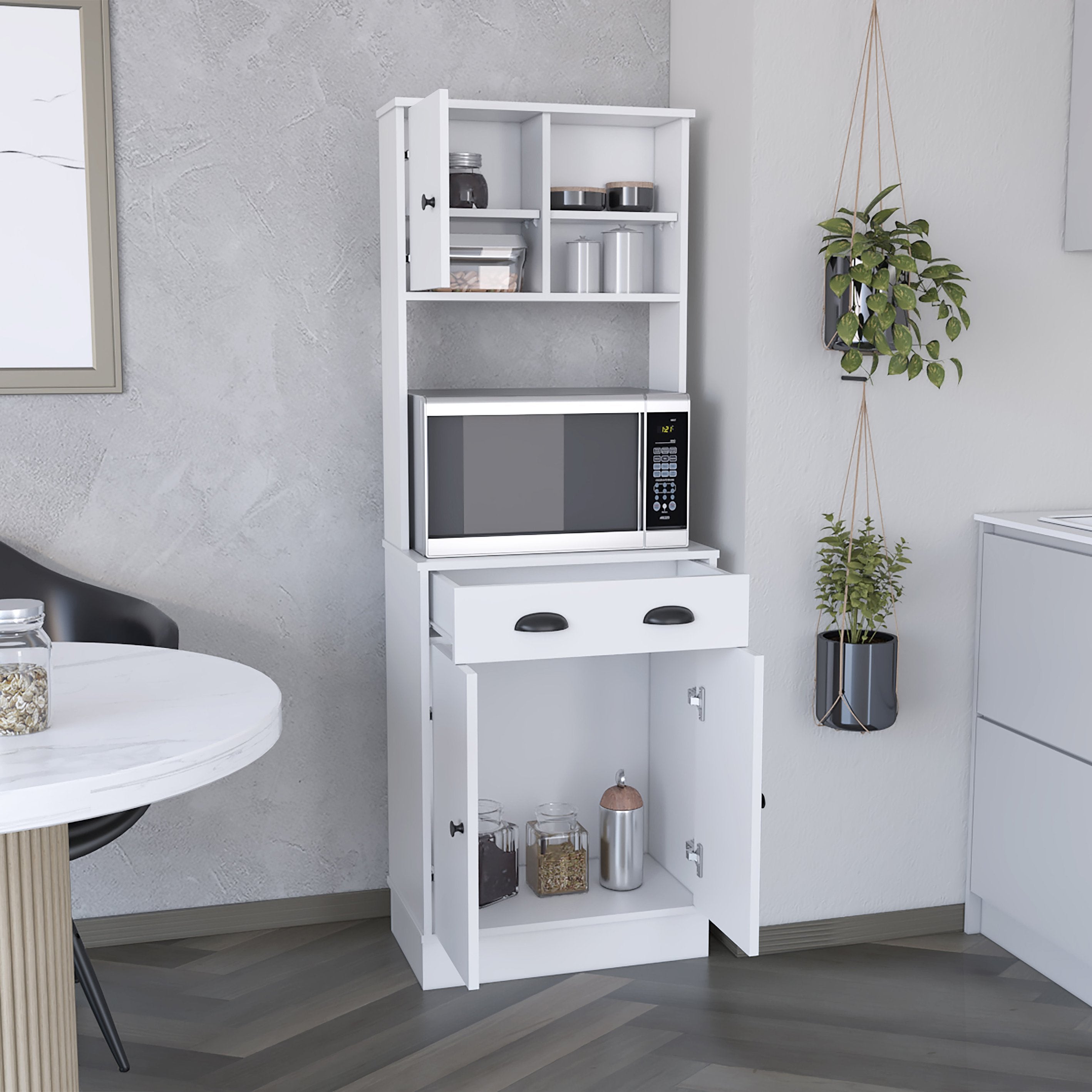Bring order and style to your kitchen with this compact white pantry cabinet—designed to maximize storage without sacrificing countertop space. Crafted from durable engineered wood, it combines open and concealed storage for everyday essentials, appliances, and display items, making meal prep and organization easier.