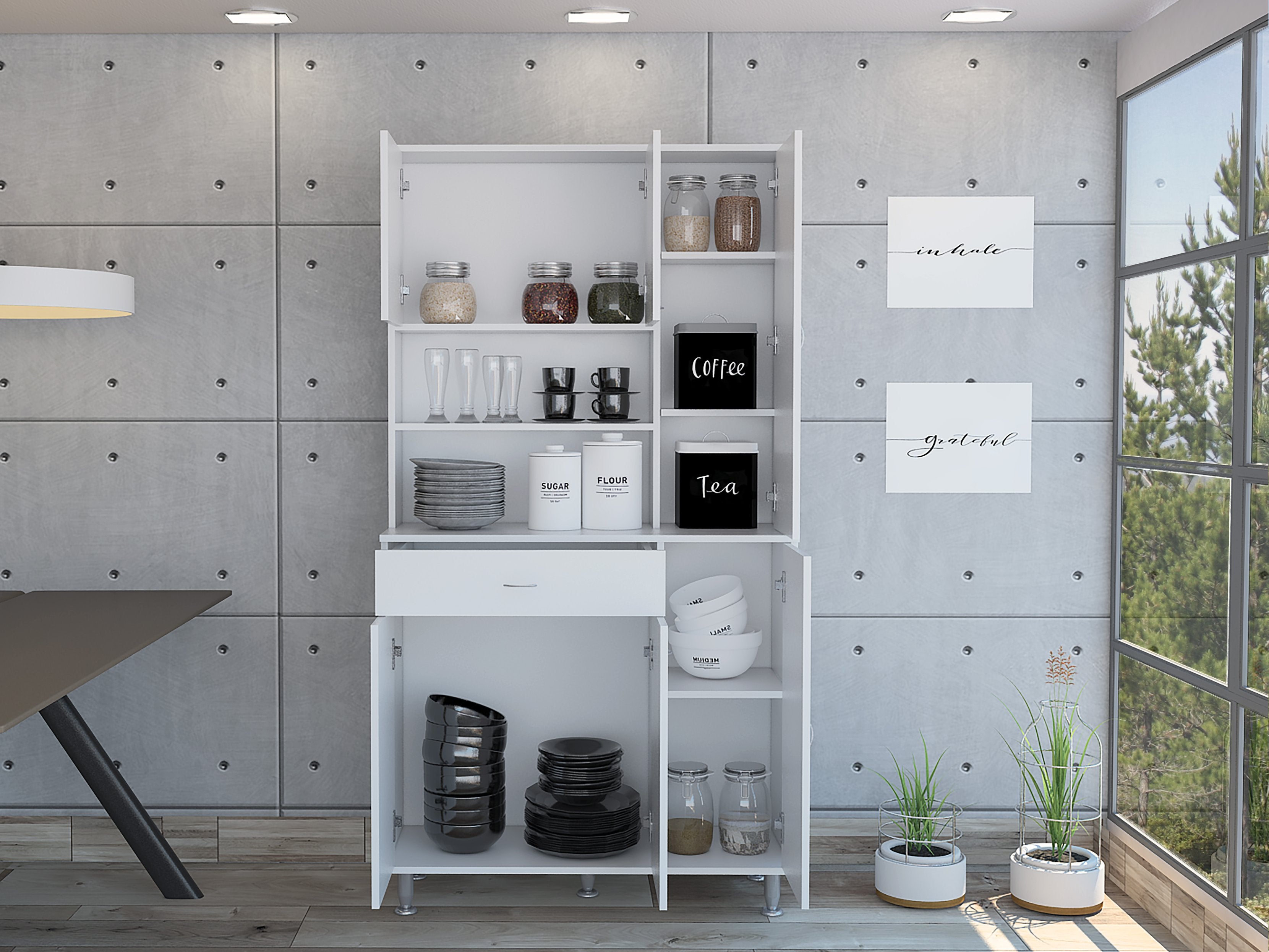 Bring order and style to your kitchen or pantry with the Venice 90 Pantry Cabinet. This compact yet spacious storage solution combines multiple closed cabinets, an easy-access drawer, and two open shelves to keep cookware, dinnerware, and pantry staples neatly organized and within reach. Its clean white finish and practical layout make it a versatile fit for modern and traditional settings.