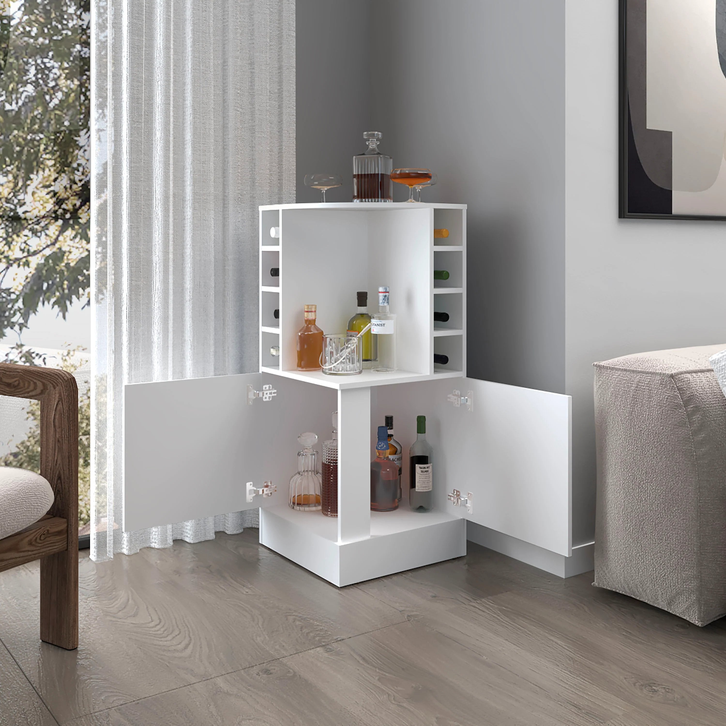 Bring clean lines and practical storage to your home bar or kitchen corner with this elegant white corner bar cabinet. Designed to maximize small spaces, it combines open shelving and a built-in bottle rack for easy organization, display, and access to glassware and beverages — all in a modern, space-saving silhouette.