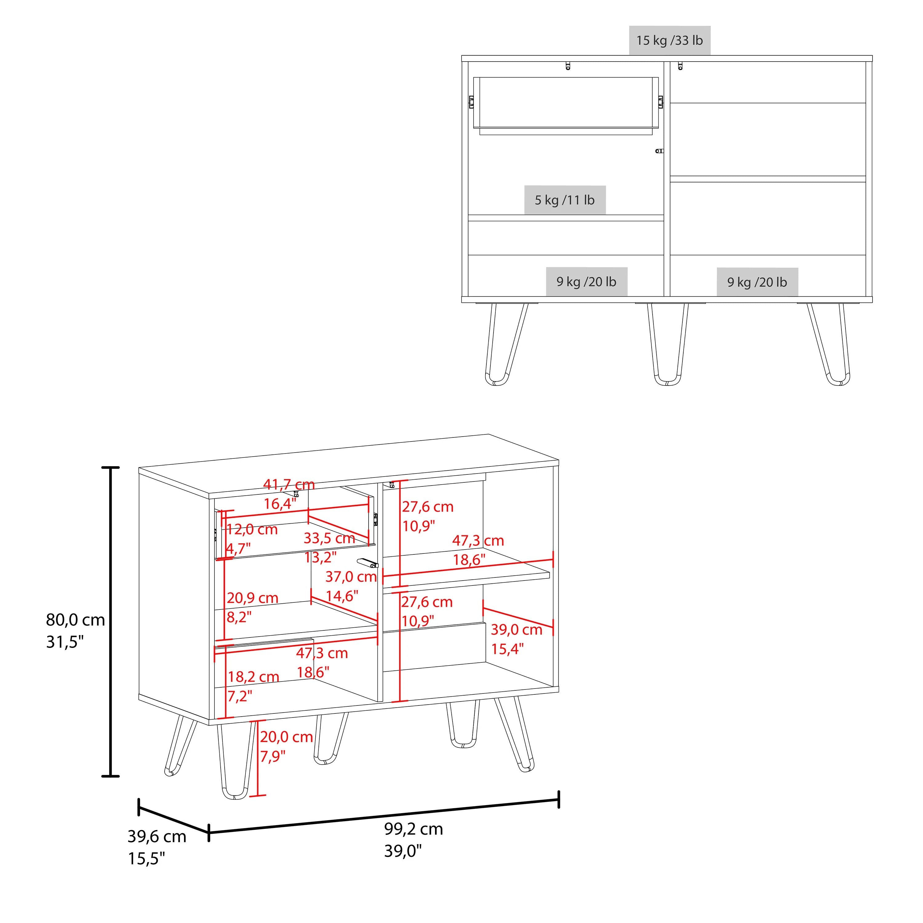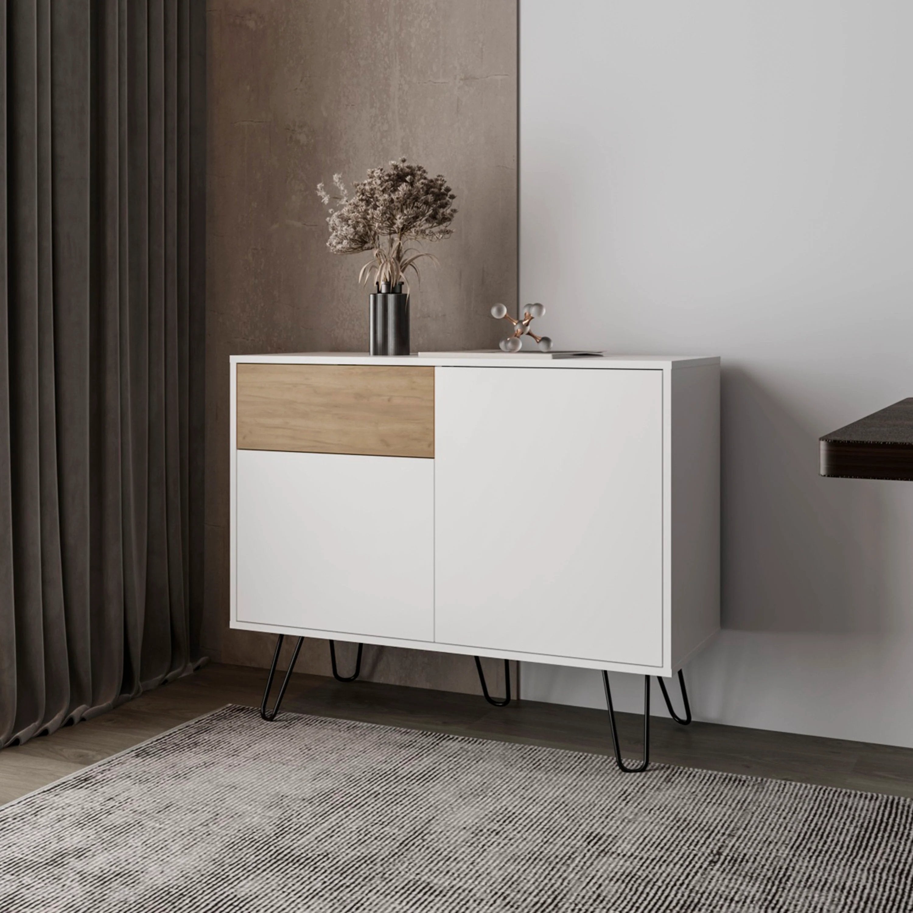 Elevate your living space with this modern White and Natural Oak sideboard, where clean lines and warm wood tones meet mid-century inspired hairpin legs. Its streamlined silhouette and practical storage make it an ideal addition to a living room, entryway, or dining area—offering both display space and concealed storage while keeping a light, airy aesthetic.